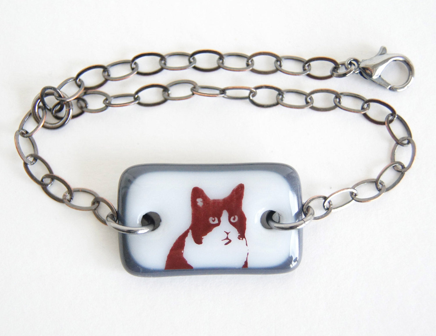 Handmade jewellery featuring illustrated and photo-based cat images on kiln-fired art glass....