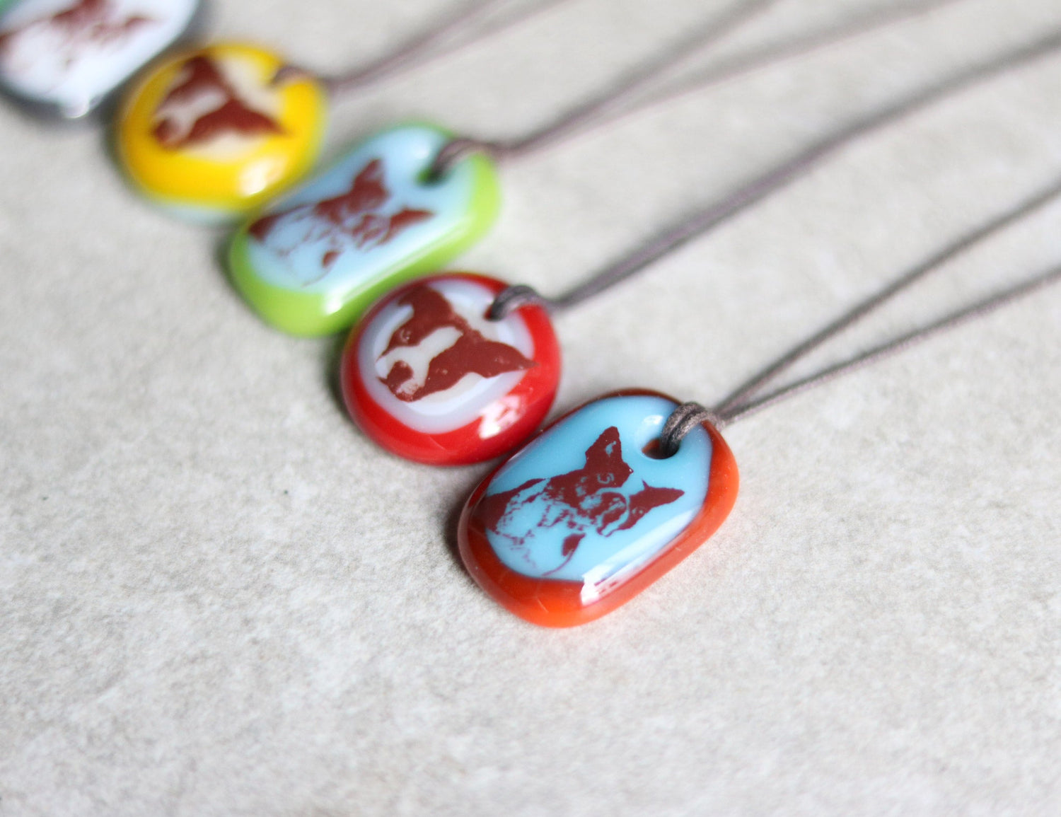 Handmade glass jewellery featuring illustrated and photo-based images of dogs on kiln-fired...