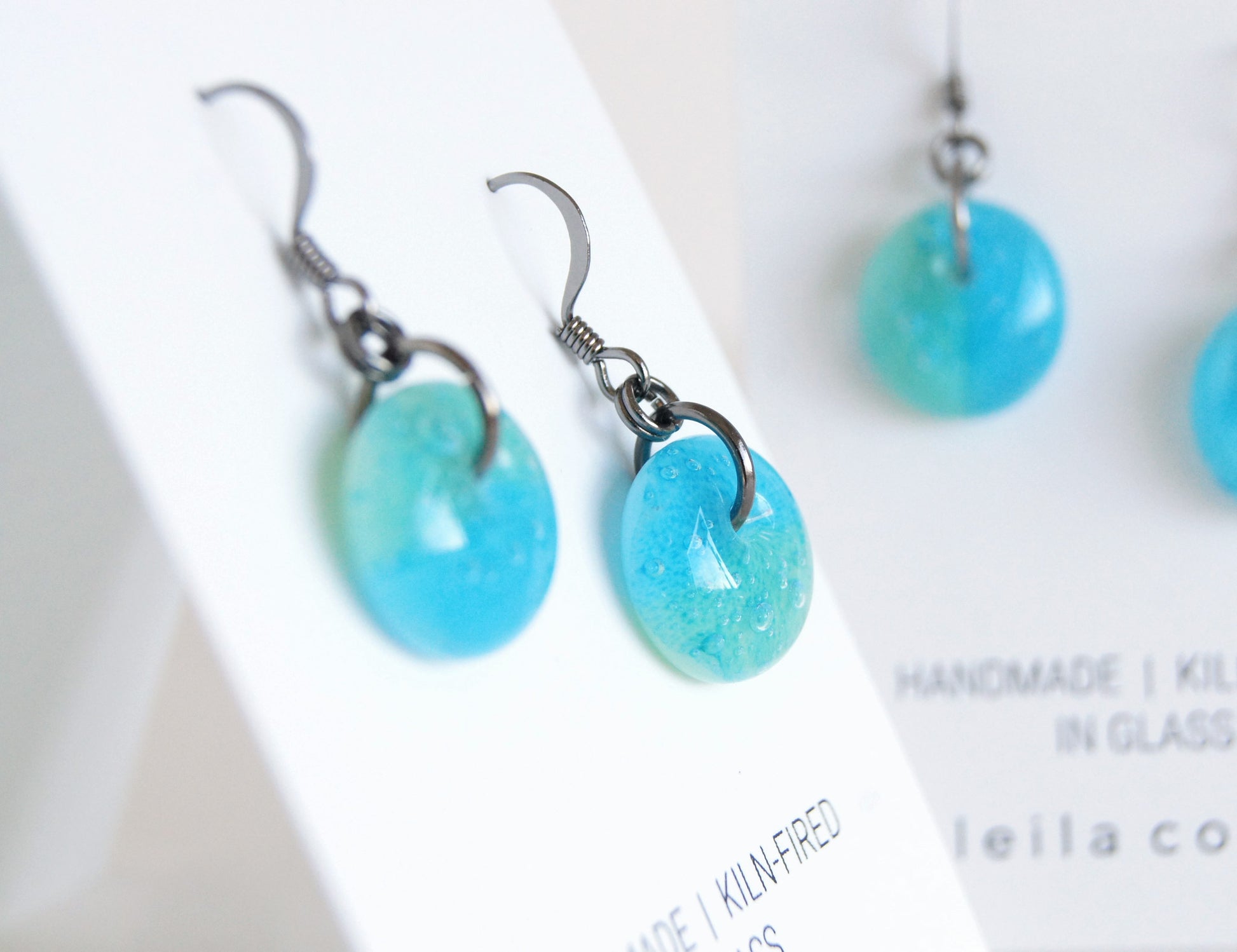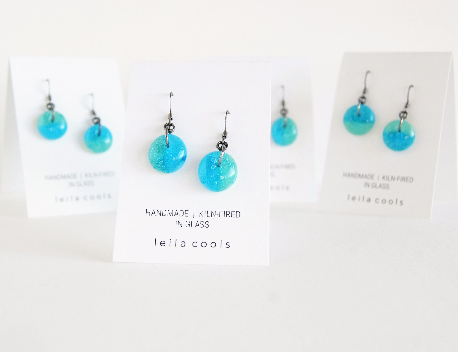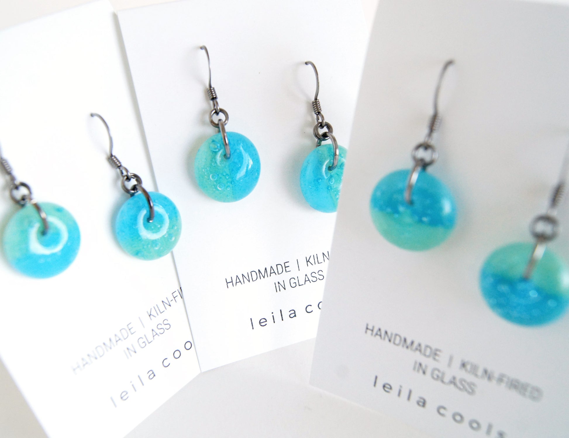 A limited batch of aqua blue and mint green colour-block glass earrings. Individually made with glass and copper. A thin layer of copper is kiln-fired and fused in between clear and aqua blue and pale mint glass. This results in encapsulated bubbles and a two colour design in aqua blue and green.