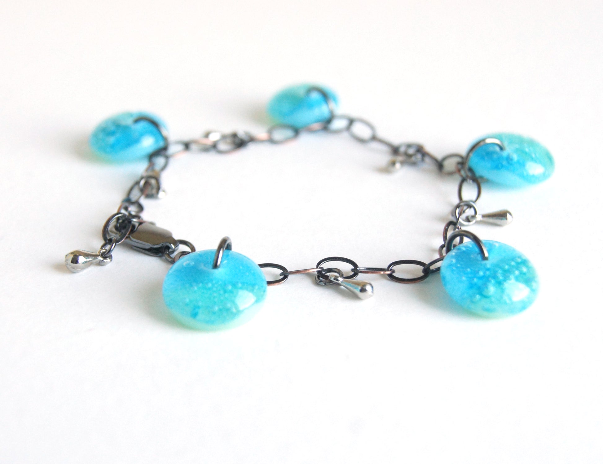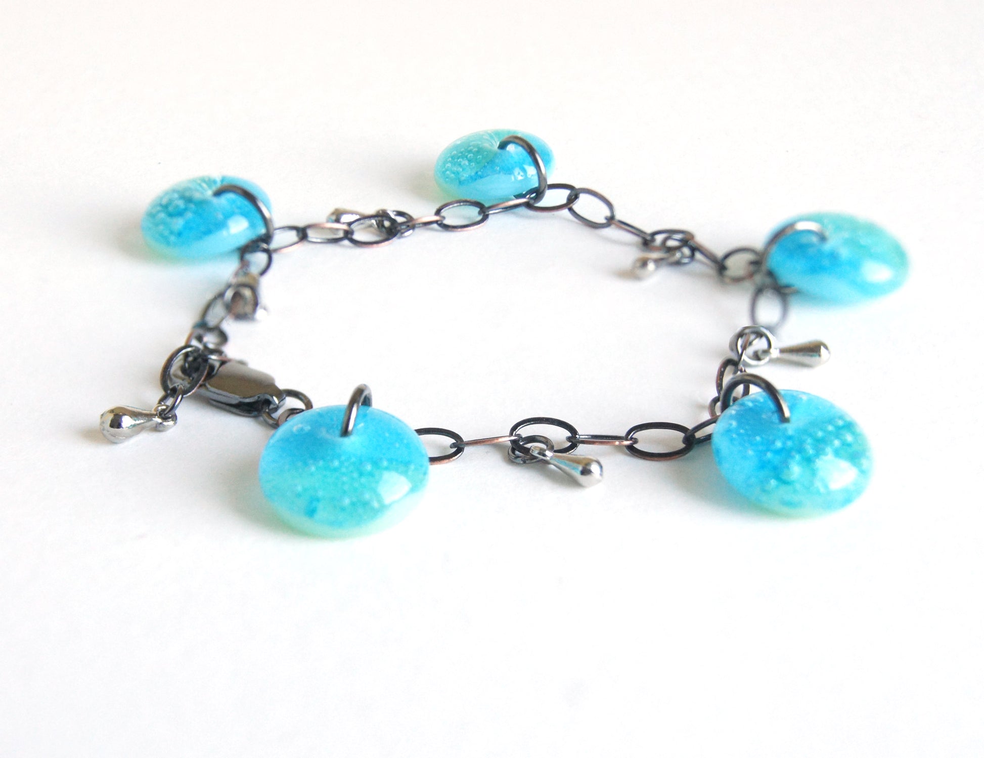 A beach blue and green one-of-a-kind bracelet with individually handmade kiln-fired glass drops, adjustable bronze colour chain and stainless steel tear drop beads.