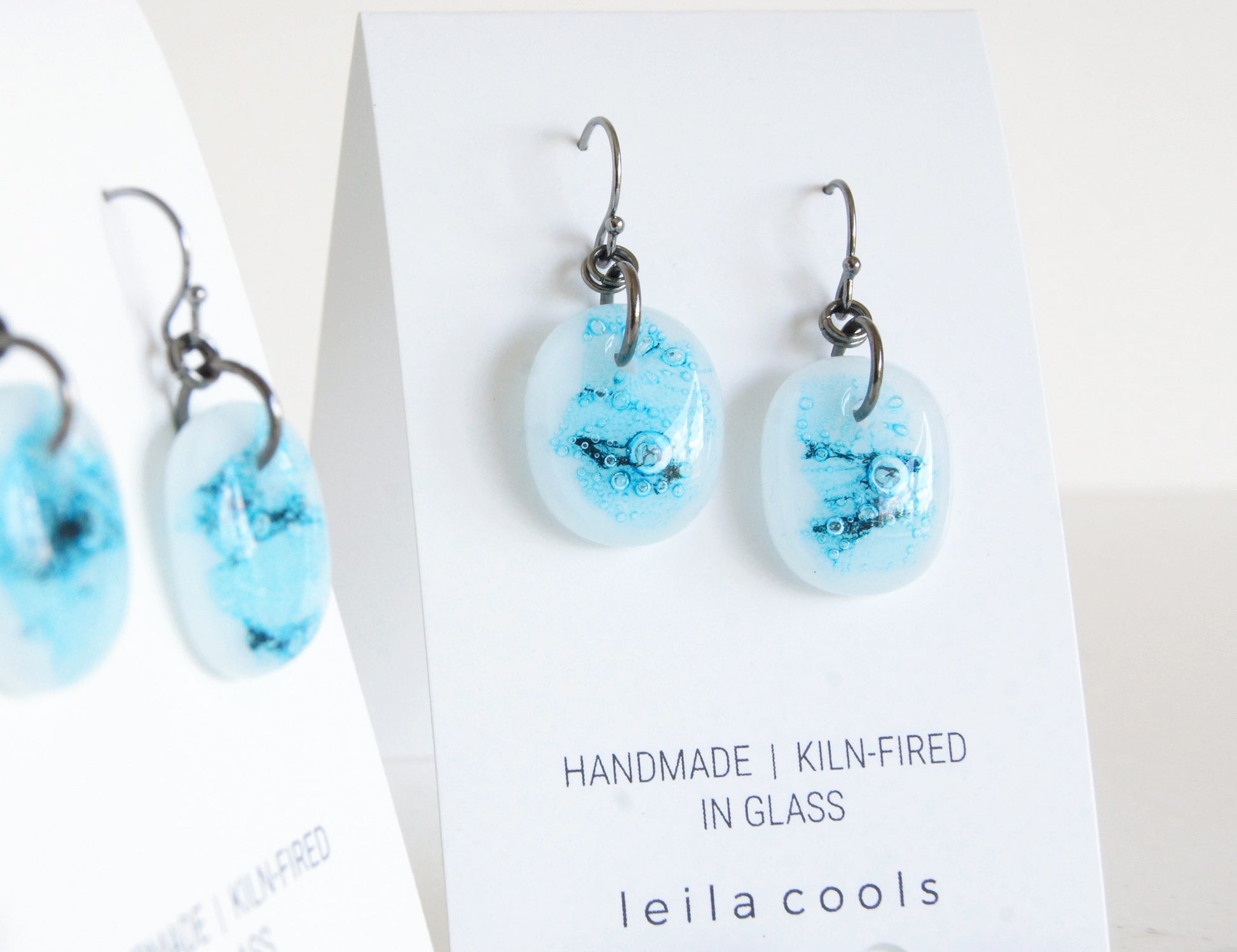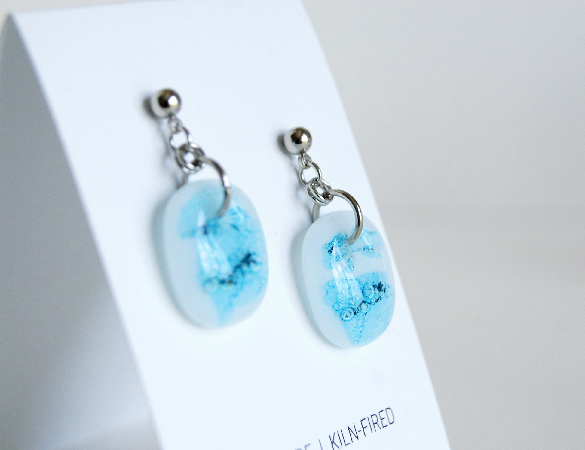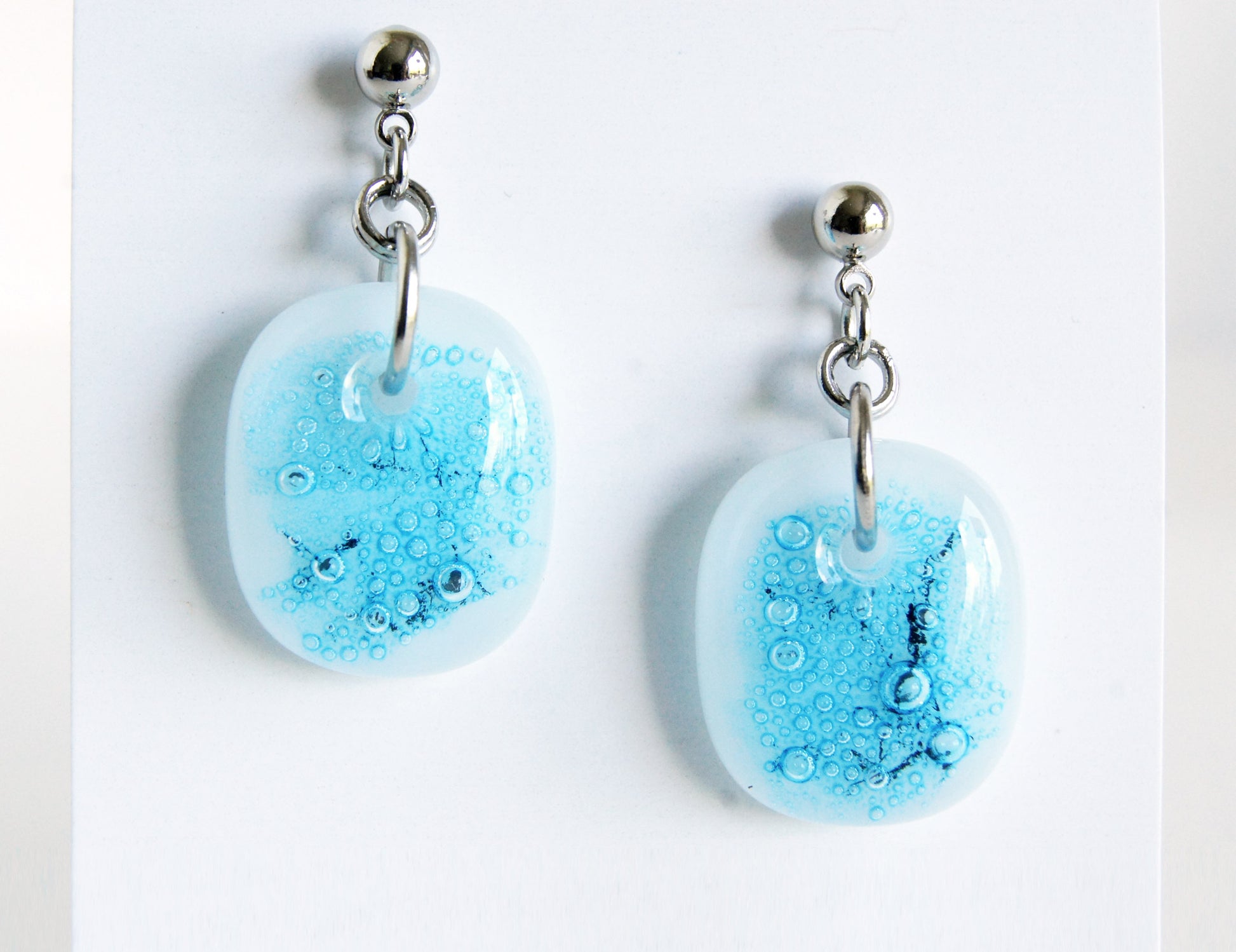 One-of-a-kind pairs of aqua blue glass earrings individually made in glass and copper. A thin layer of copper is kiln-fired and fused in between clear and semi-opaque white glass. This results in encapsulated bubbles and a blue marbling effect for semi-transparent earrings.