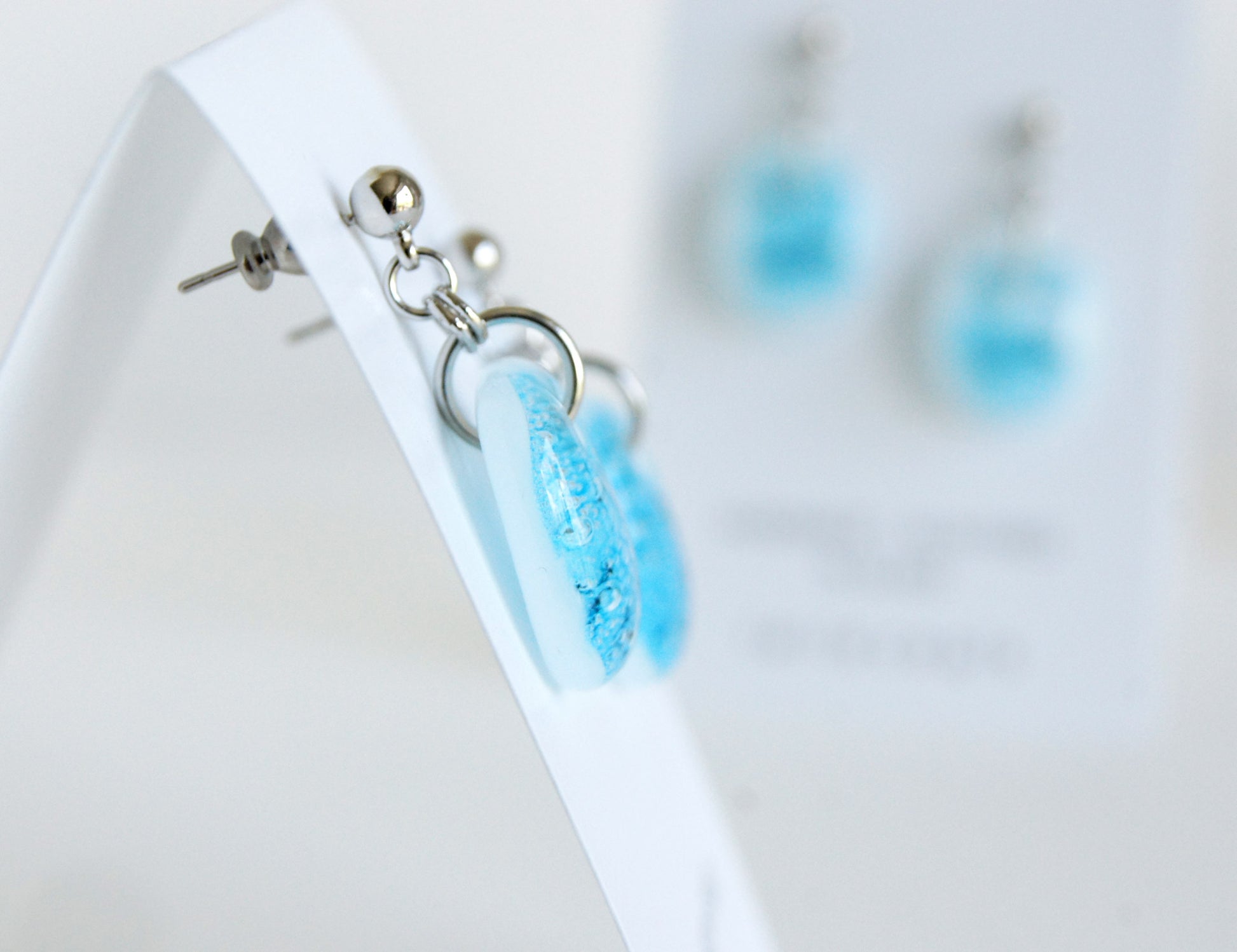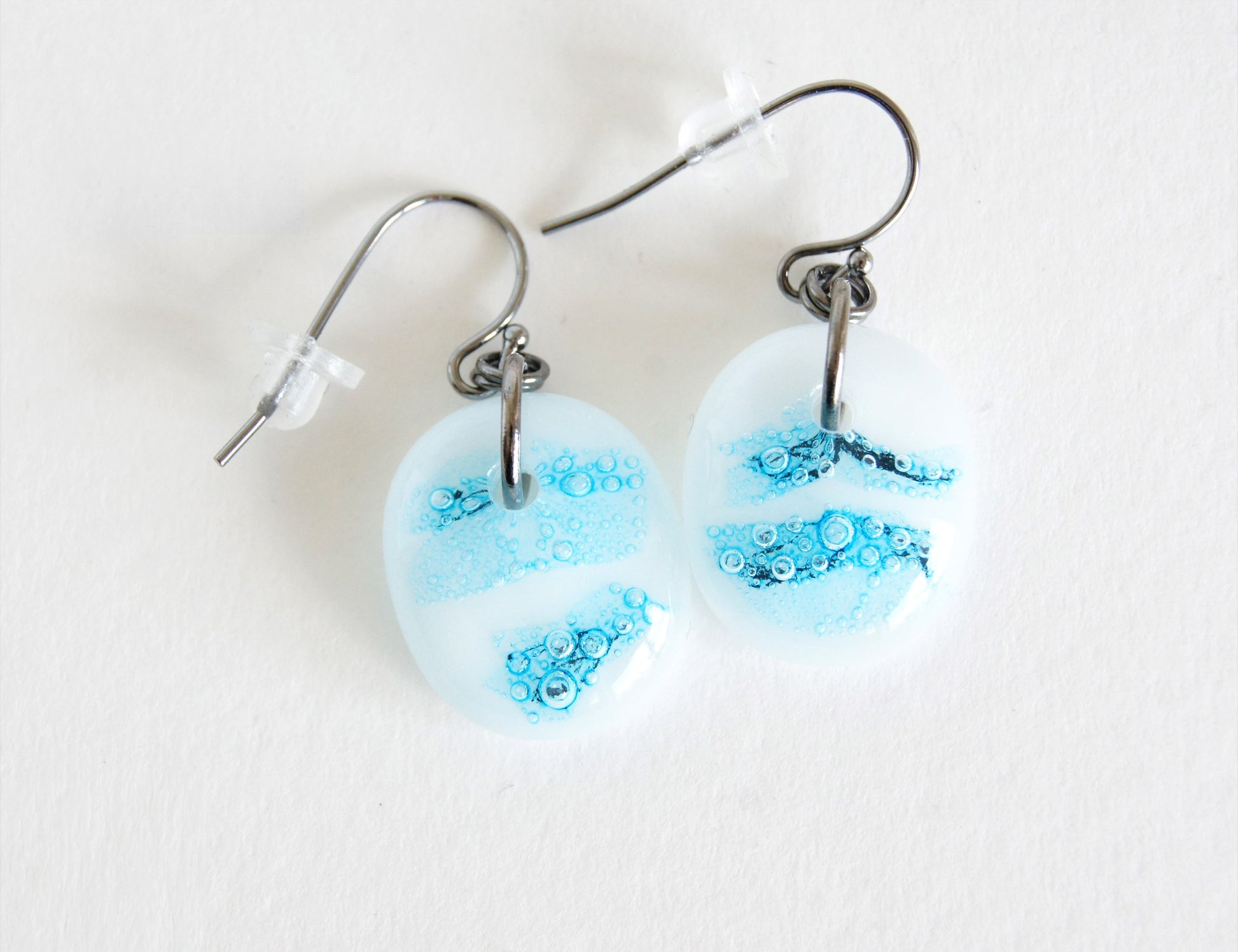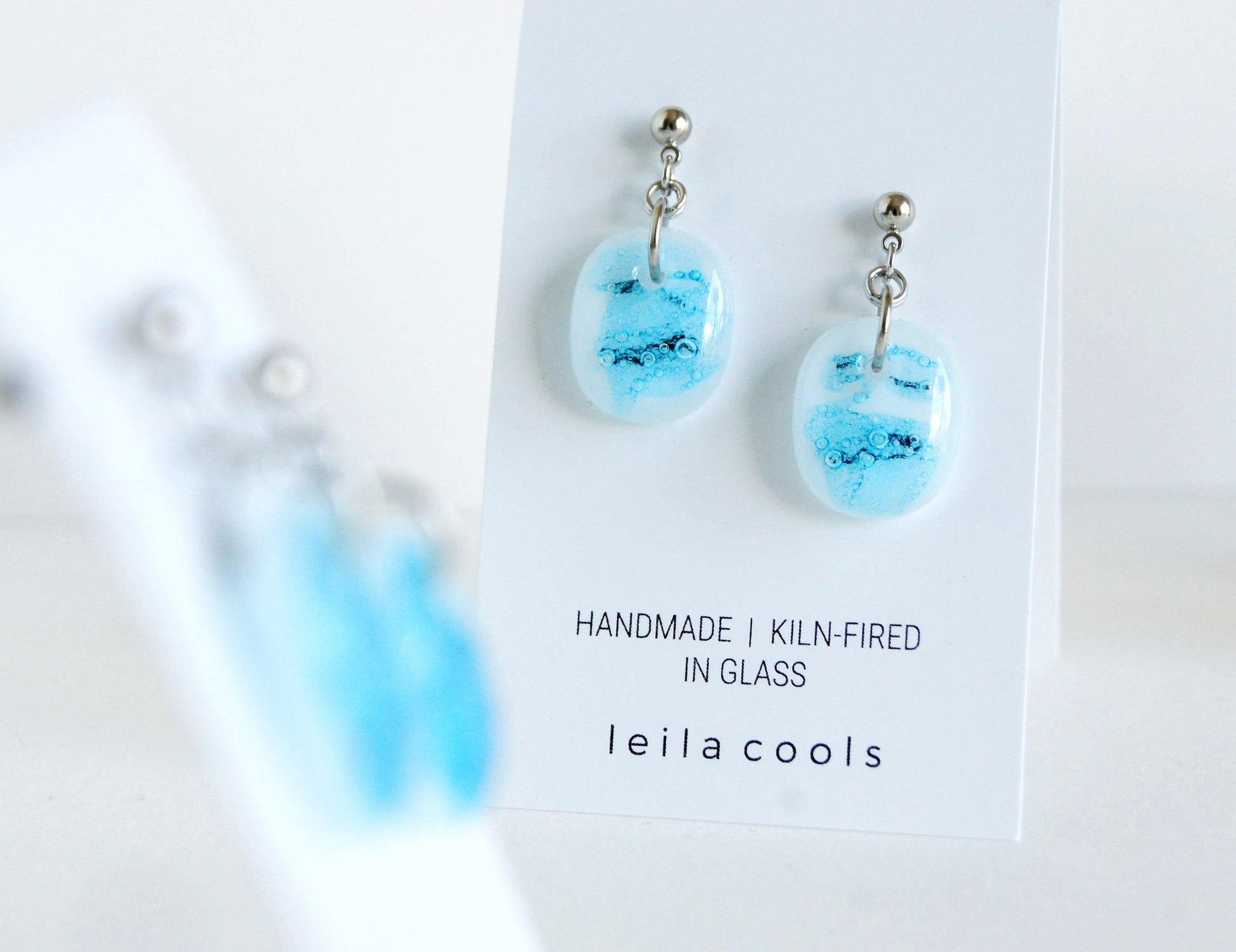 One-of-a-kind pairs of aqua blue glass earrings individually made in glass and copper. A thin layer of copper is kiln-fired and fused in between clear and semi-opaque white glass. This results in encapsulated bubbles and a blue marbling effect for semi-transparent earrings.