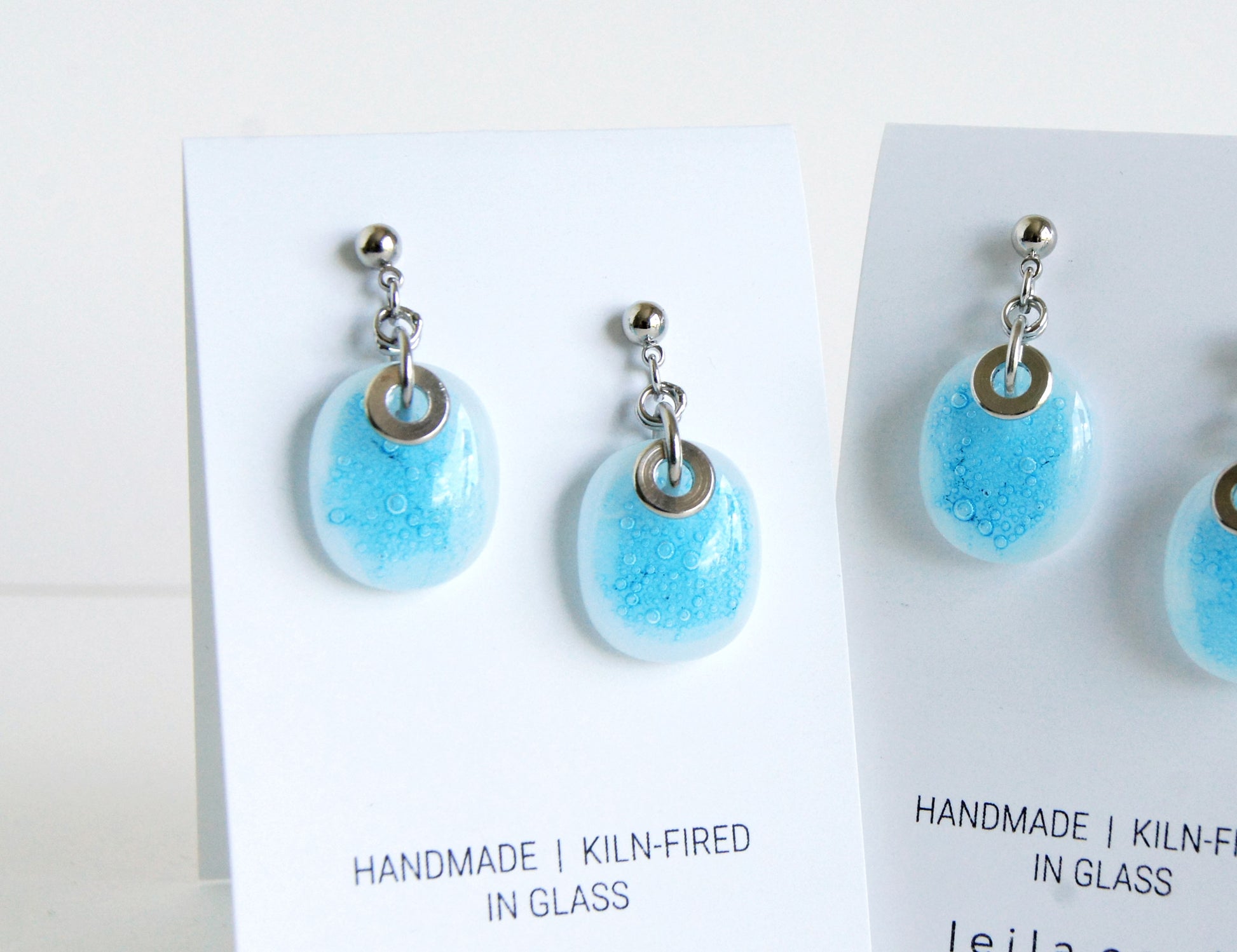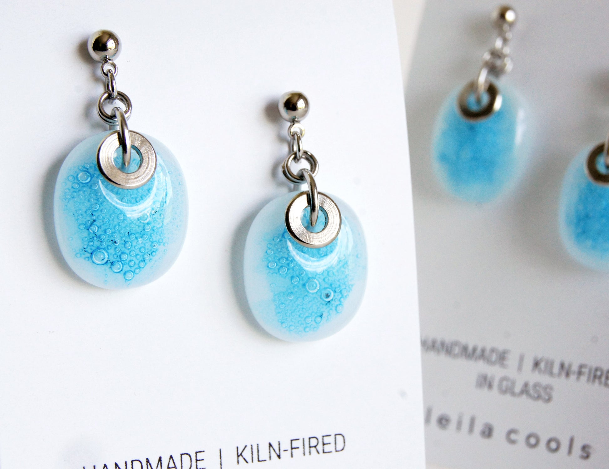 A single one-of-a-kind pair of aqua blue glass earrings individually made in glass and copper. A thin layer of copper is kiln-fired and fused in between clear and semi-opaque white glass. This results in encapsulated bubbles and an aqua blue patina for semi-transparent earrings.
