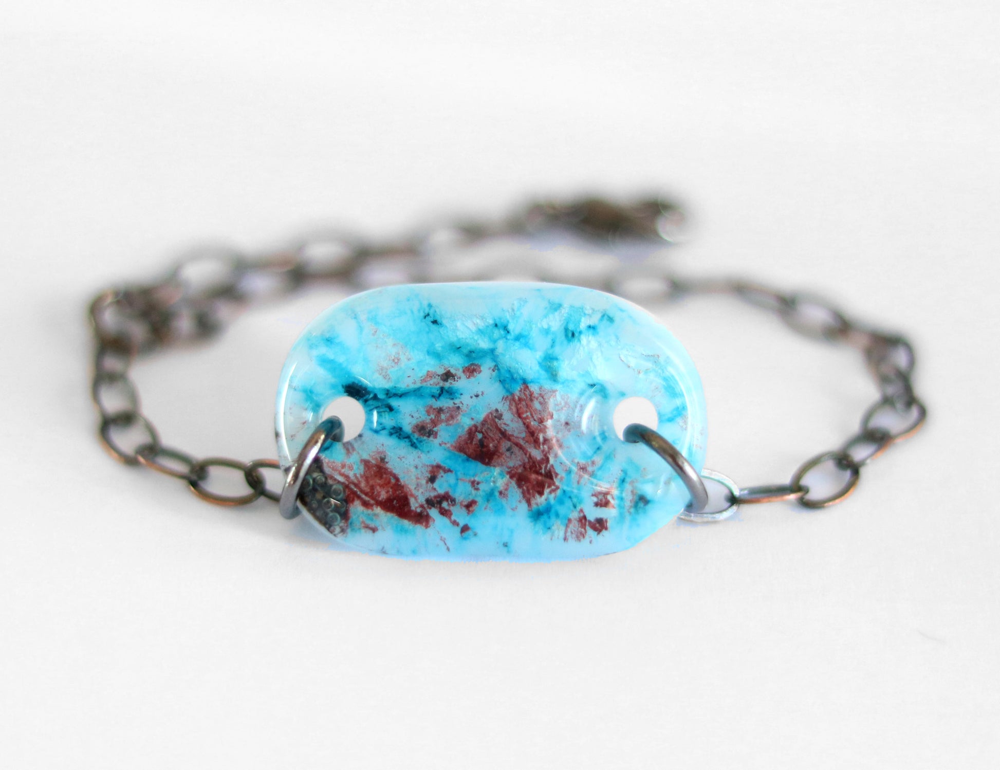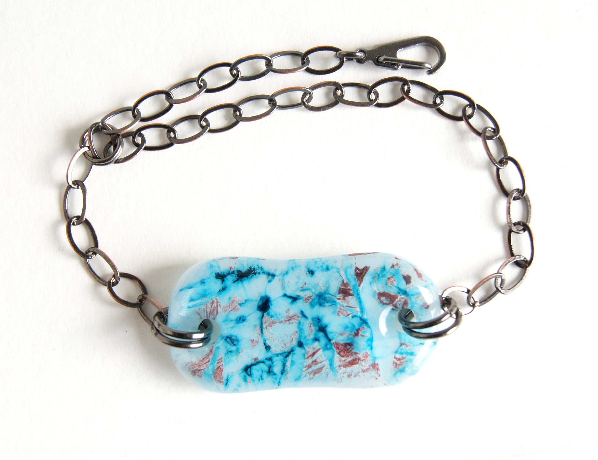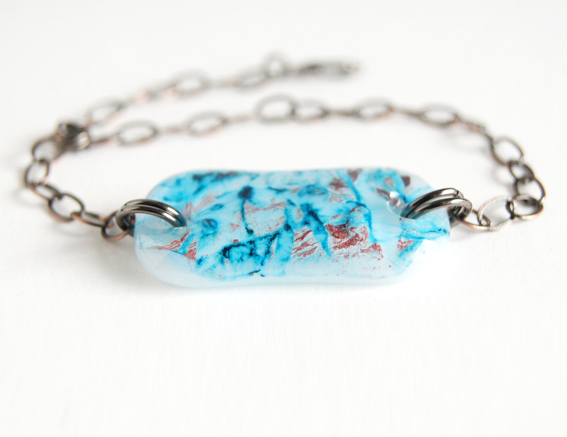 Two one-of-a-kind glass bracelets with an organic design created by fusing copper and other metals inside layers of white and clear glass. Individually handmade and kiln-fired.
