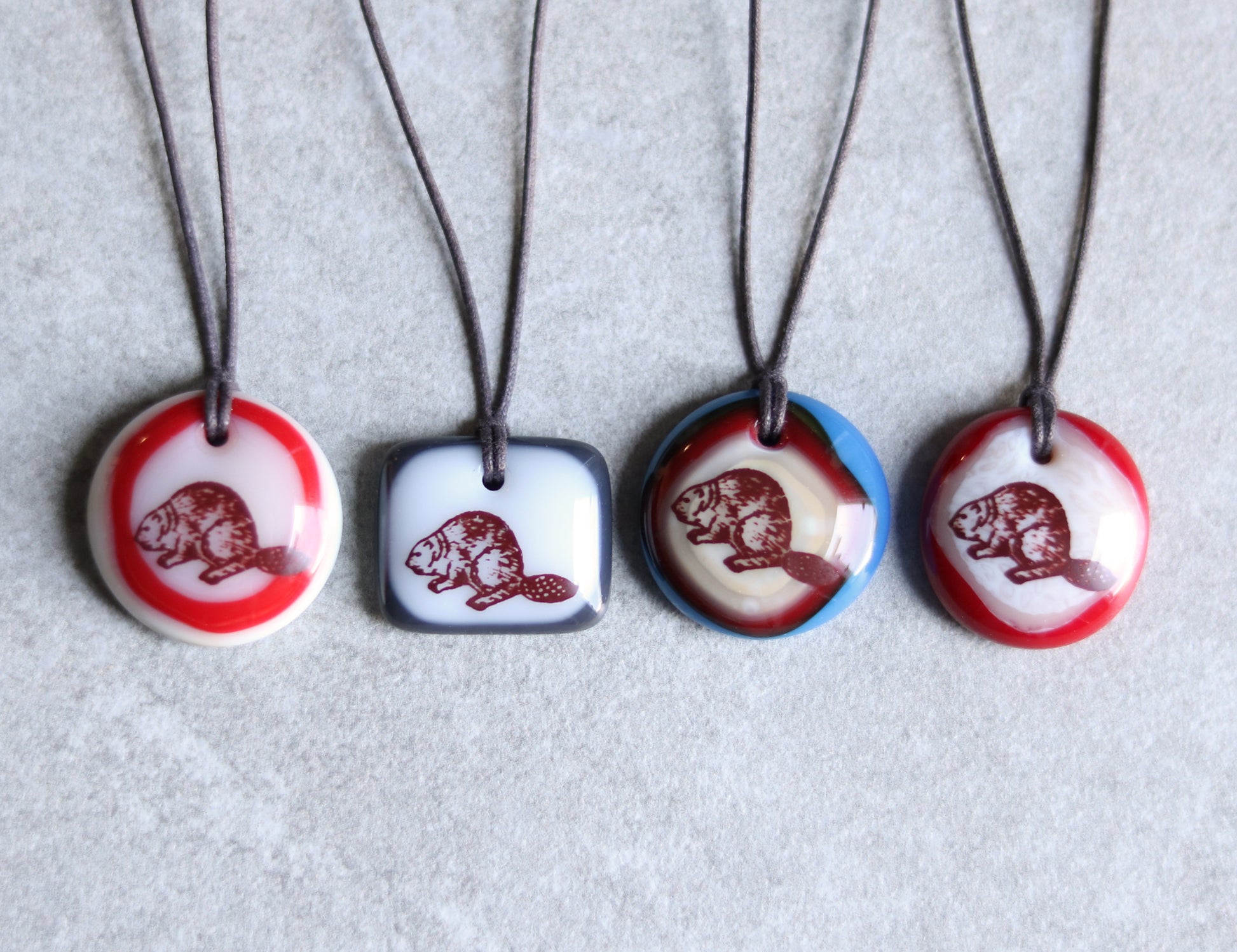 An illustration of a beaver permanently fused to a kiln-fired handmade glass pendant necklace, handmade by Leila Cools.