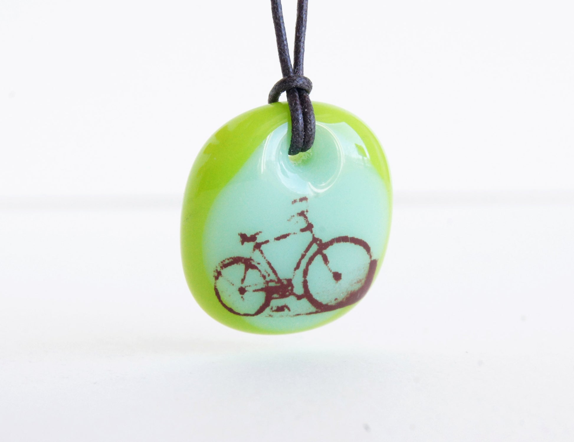 This bicycle necklace was individually made in colourful kiln-fired glass, handmade by Leila Cools.