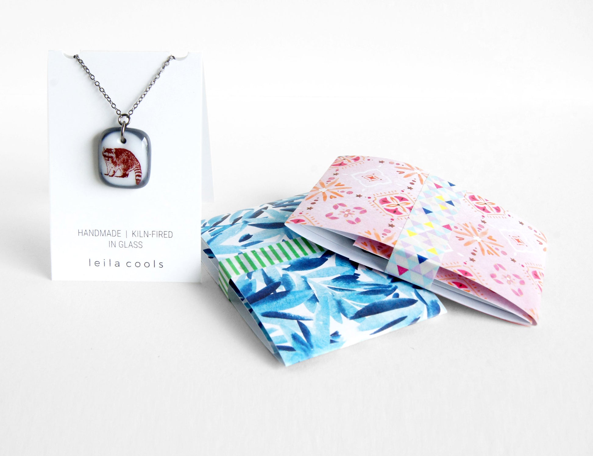 My GLASS pieces are made from scratch and kiln-fired. The CORD necklaces are made with high quality Japanese waxed cotton. Most CHAIN parts and CLASPS are metal alloy unless specified or requested.