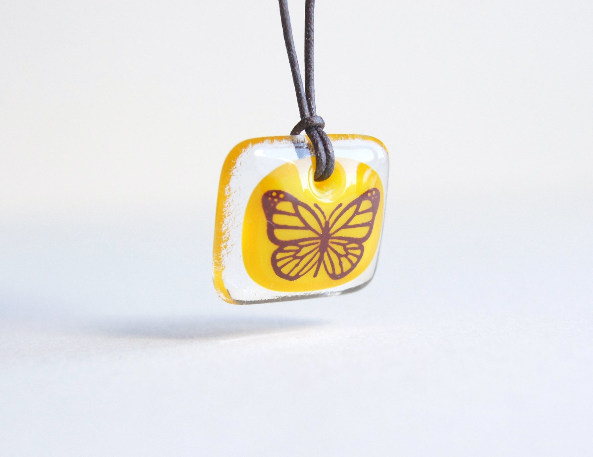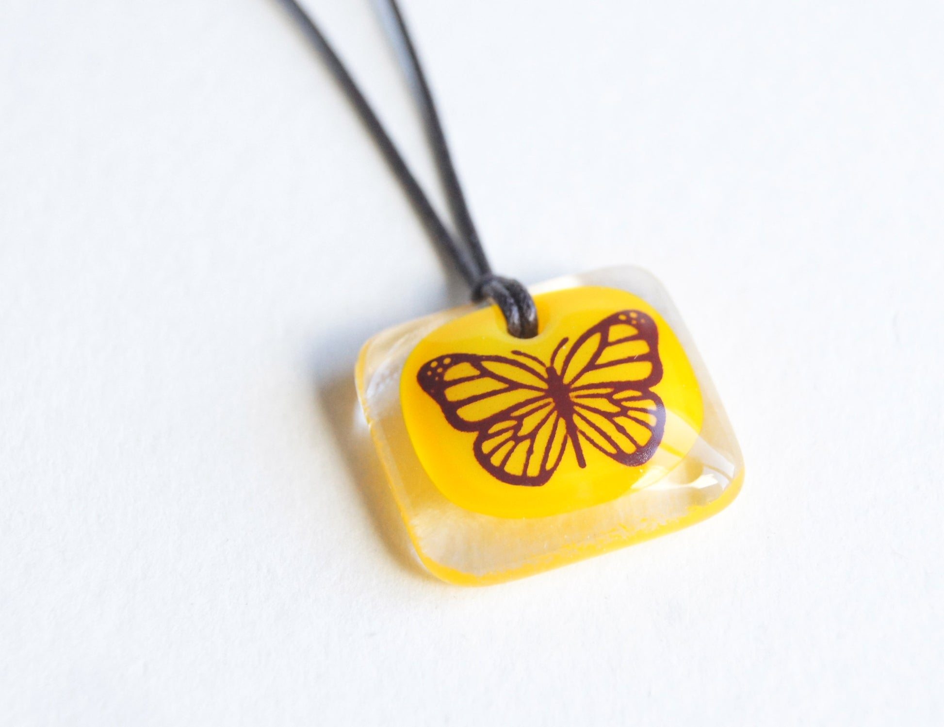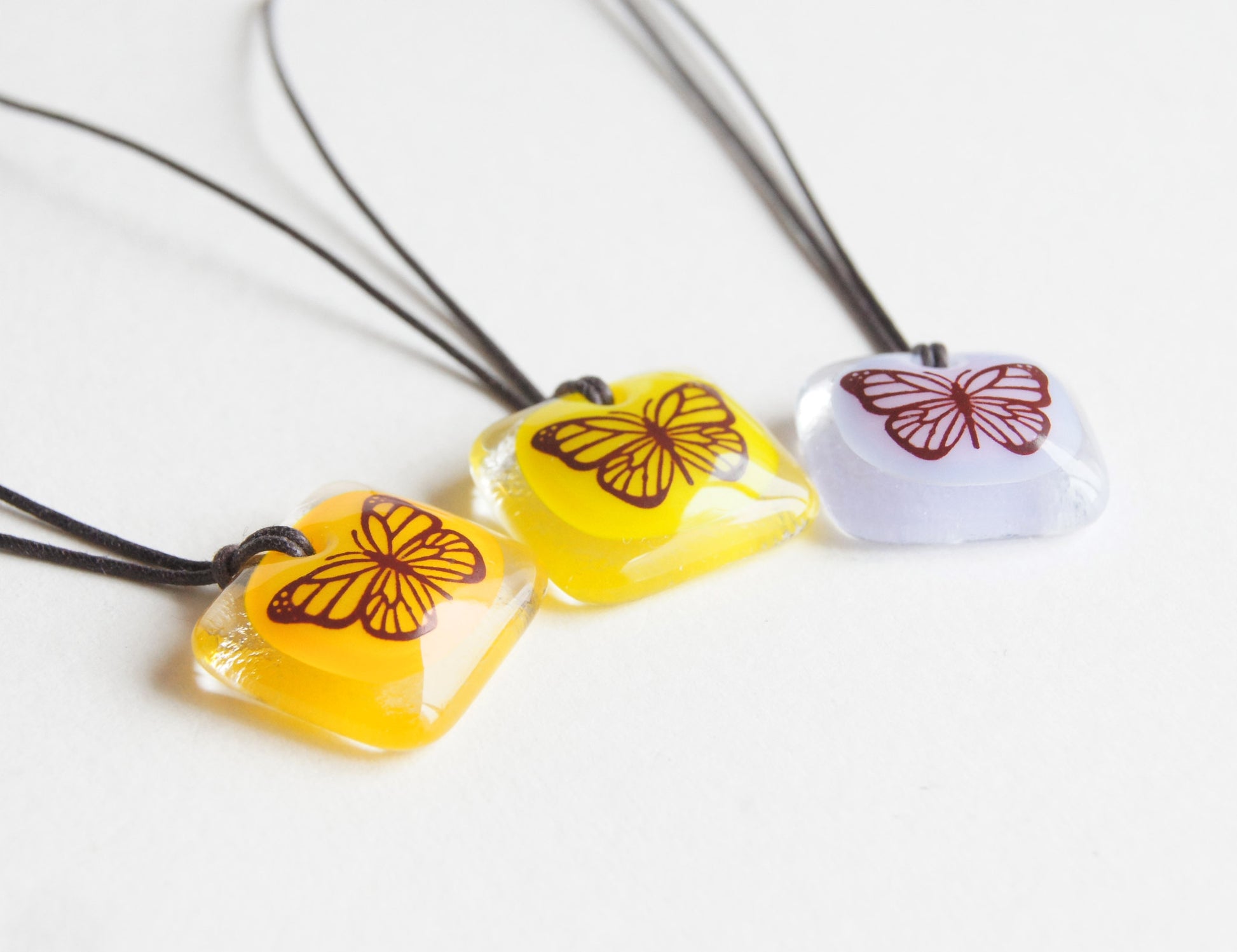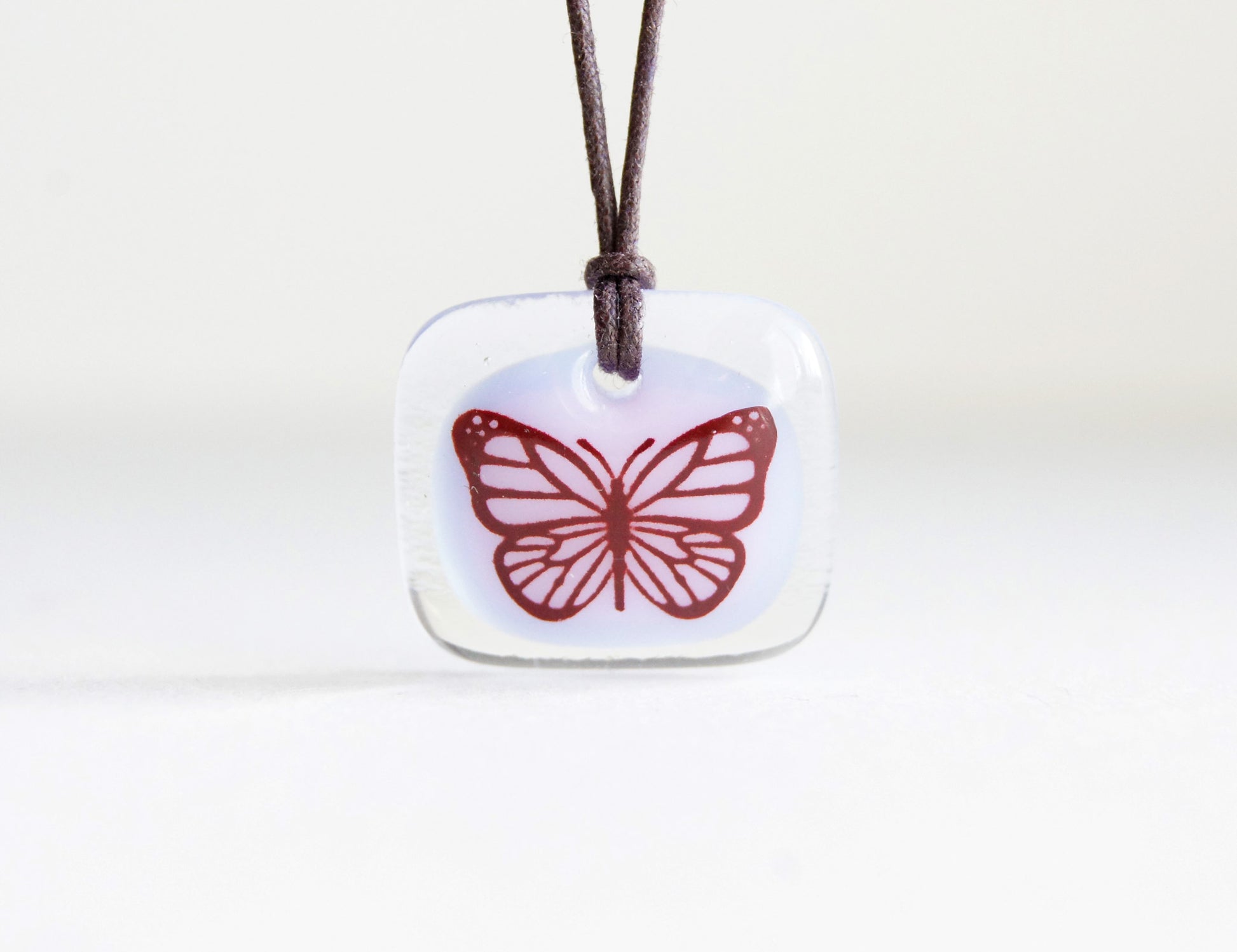 This butterfly necklace was individually made in colourful kiln-fired glass, handmade by Leila Cools.