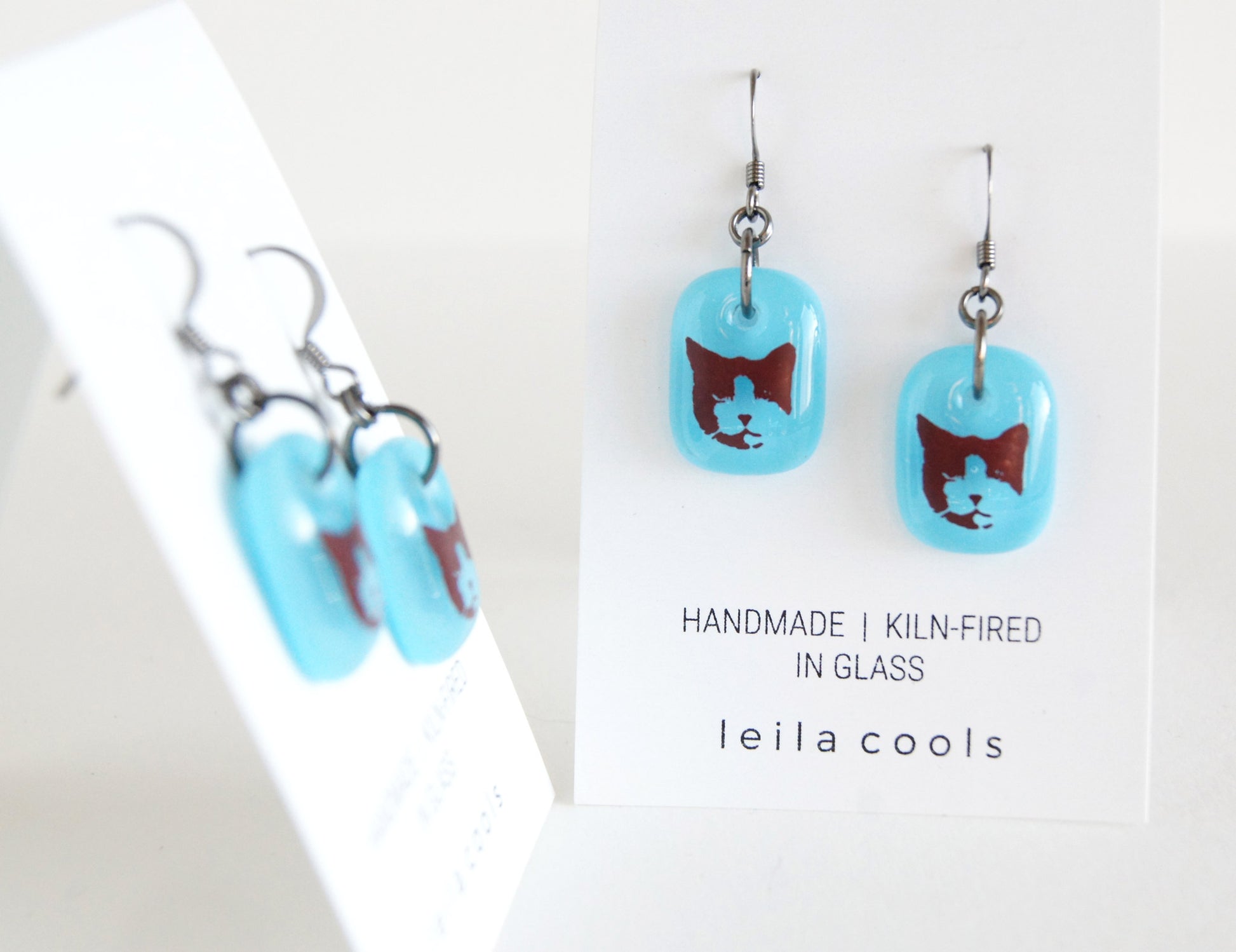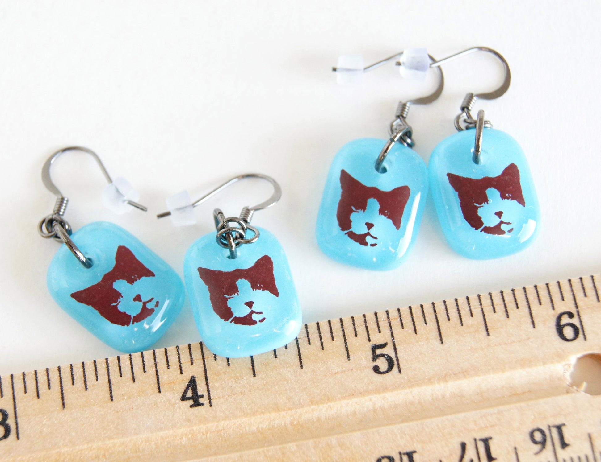 Cat Earrings individually handmade with kiln-fired glass. Aqua glass topped with clear glass for a translucent effect.