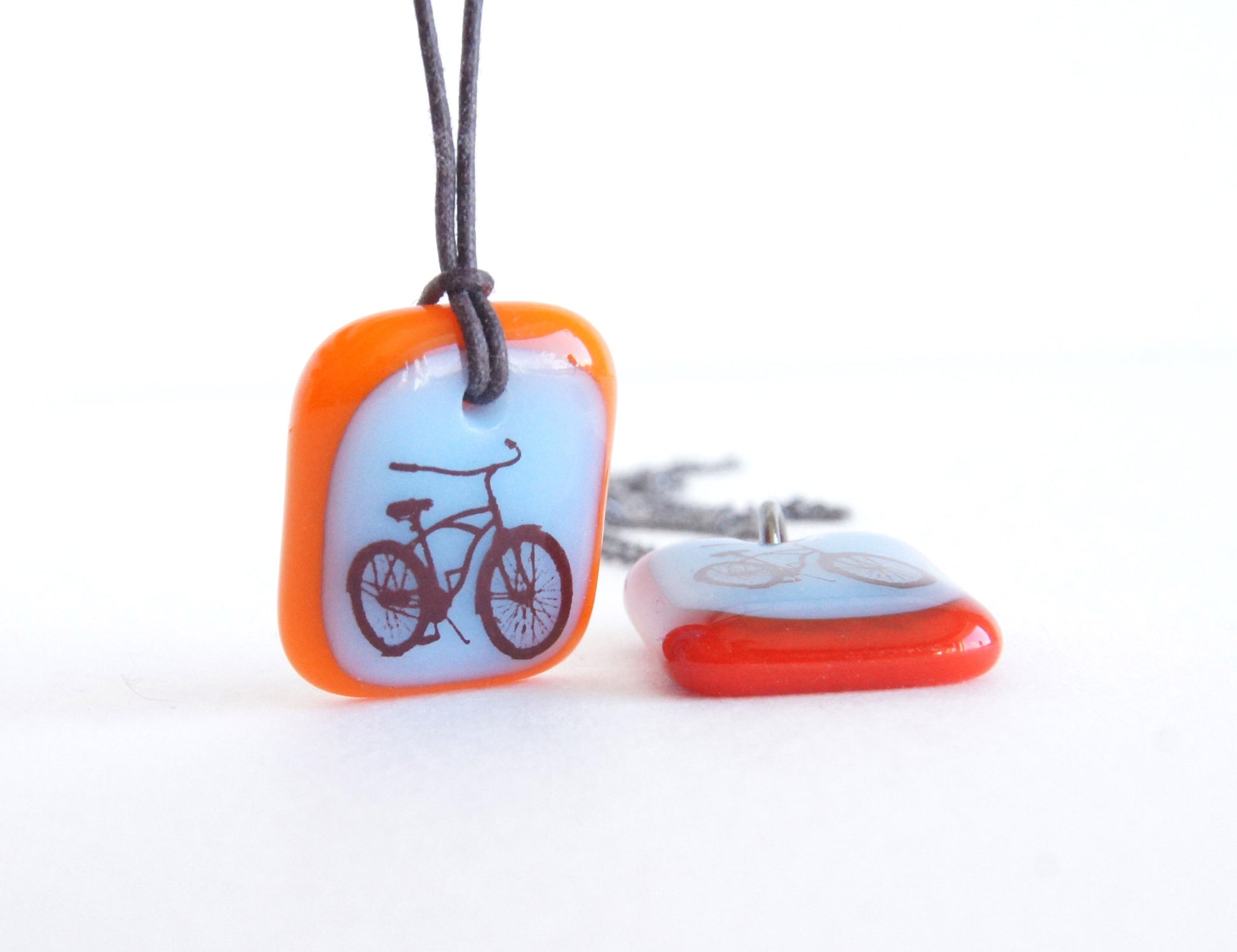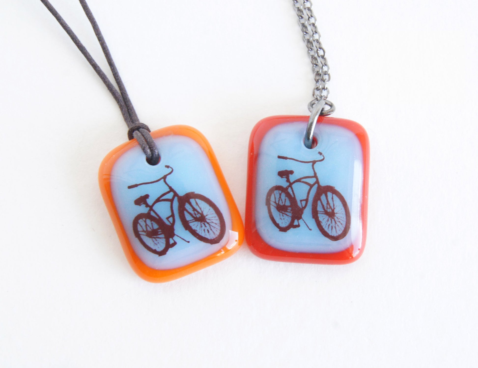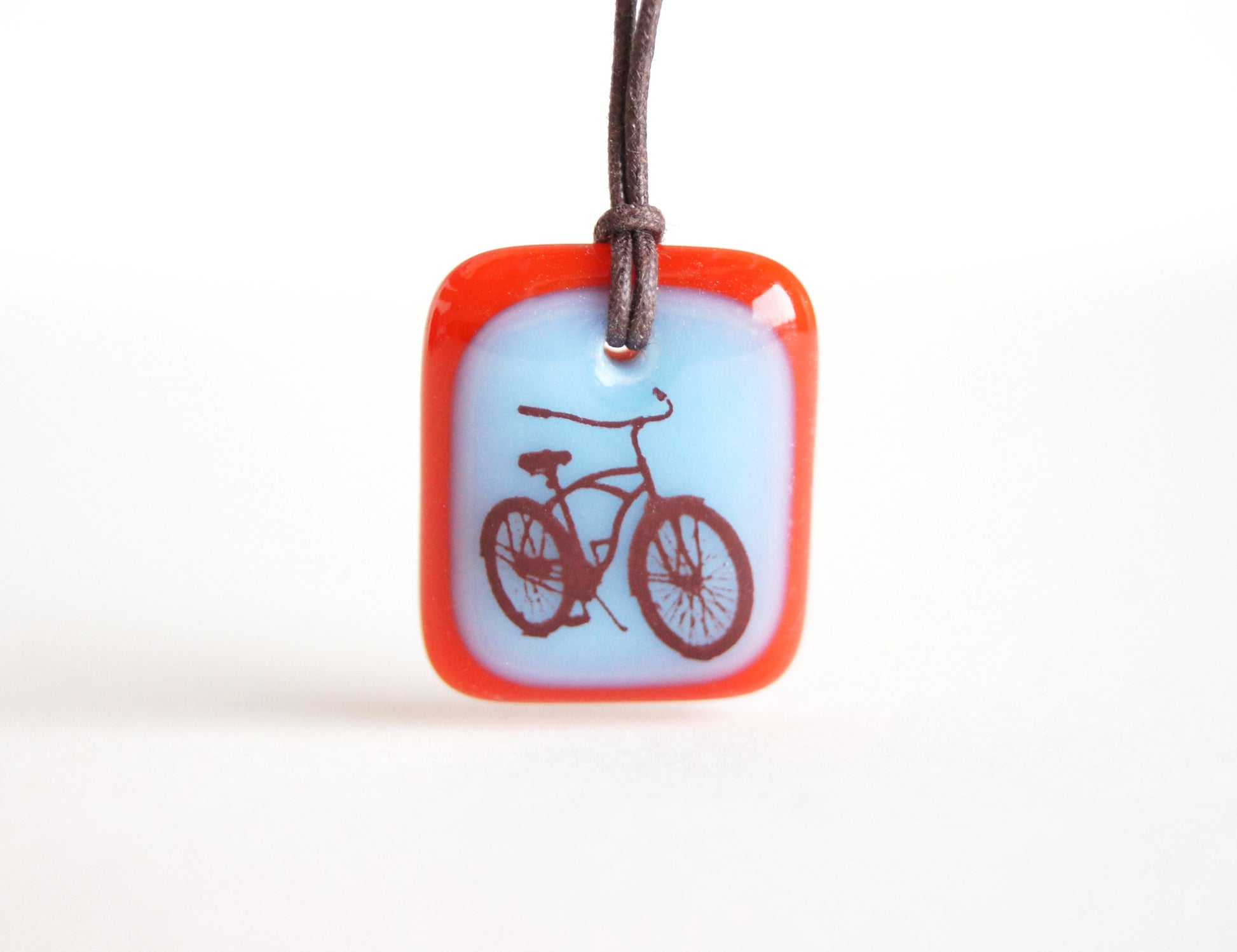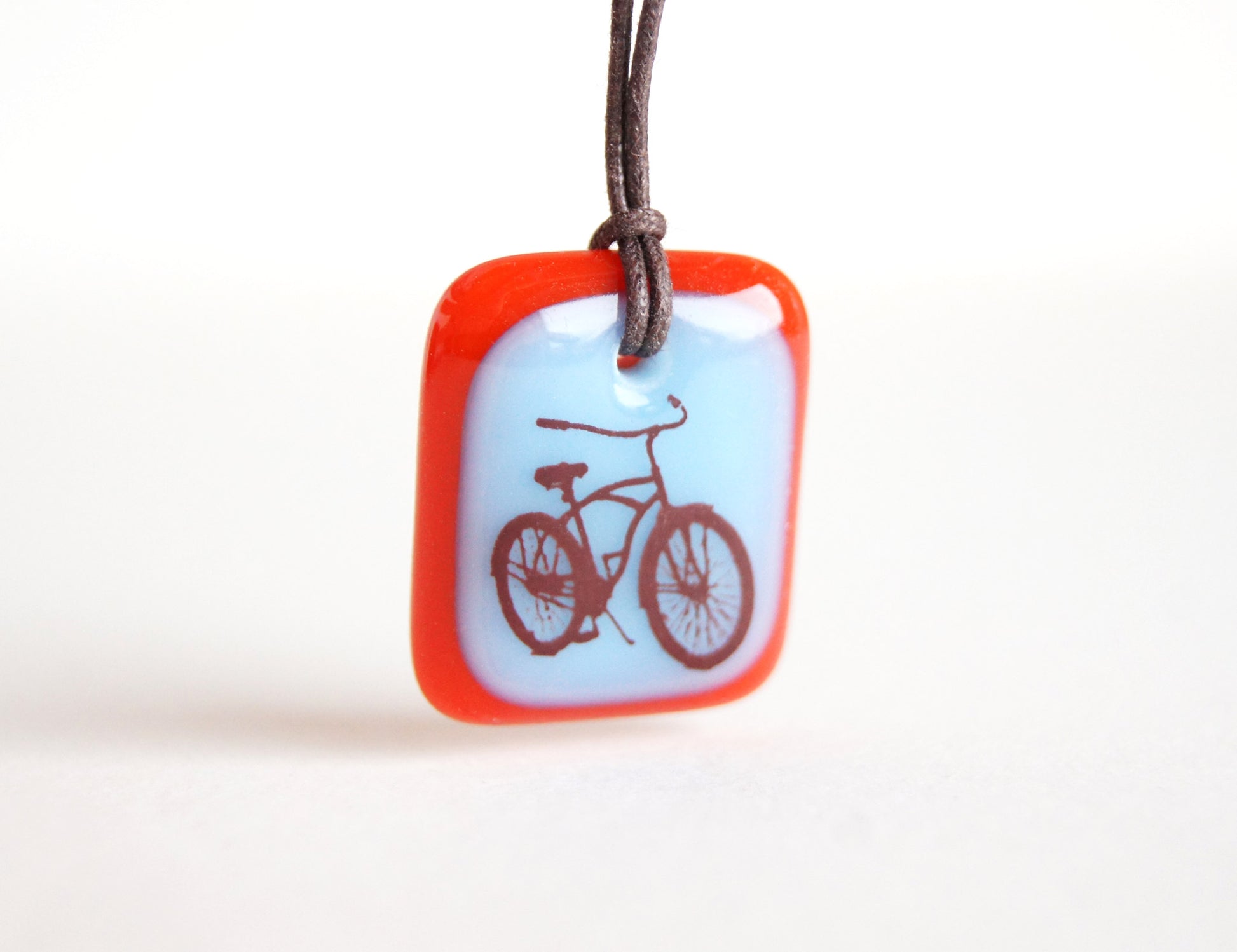 This beach cruiser bicycle necklace was individually made in colourful kiln-fired glass, handmade by Leila Cools.