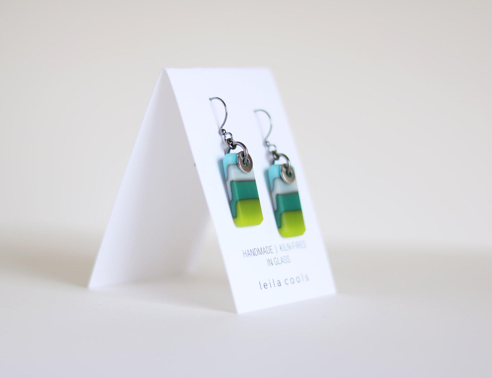 Delicate rectangular earrings individually handmade, kiln-fired and shaped in glass with small metal washer beads.