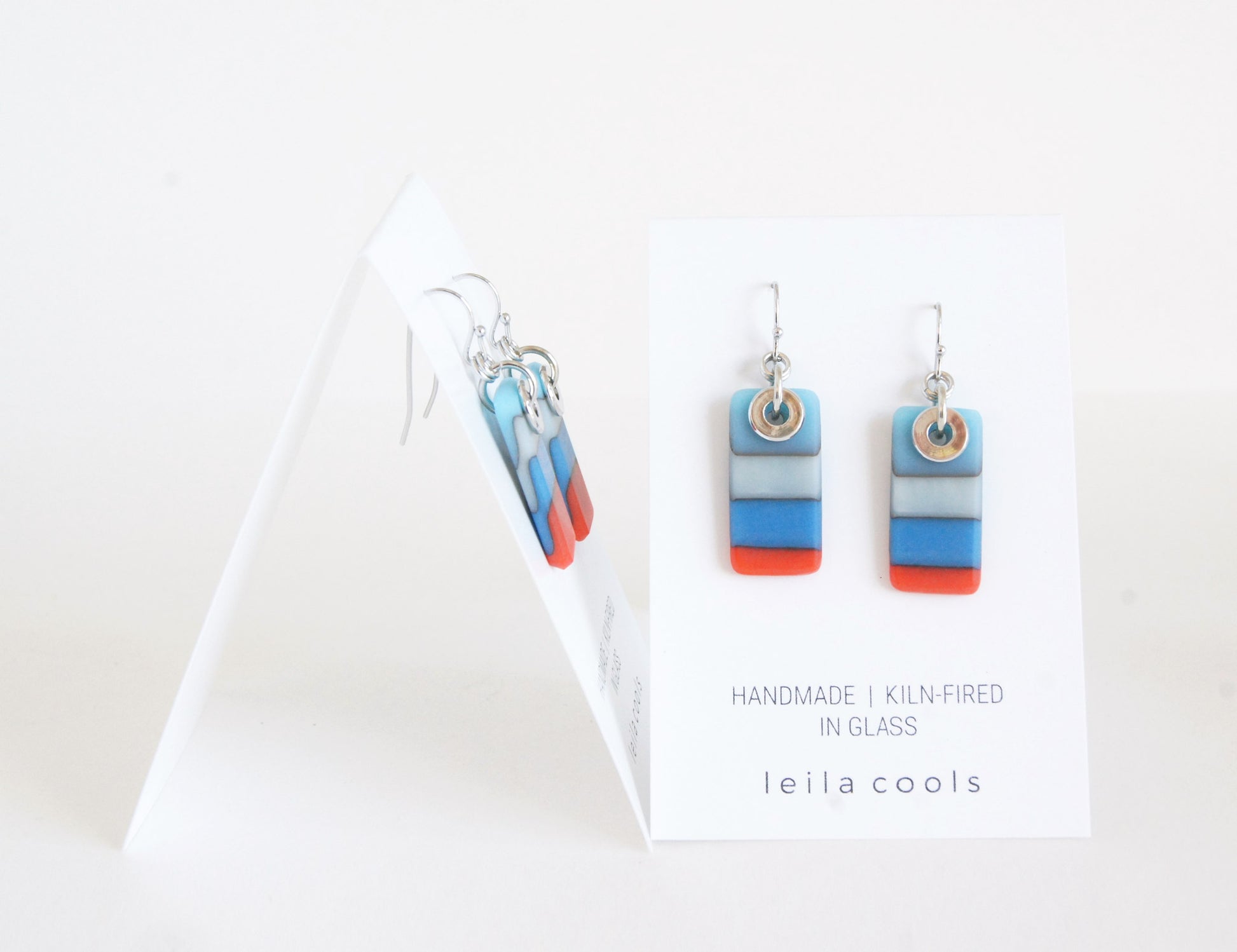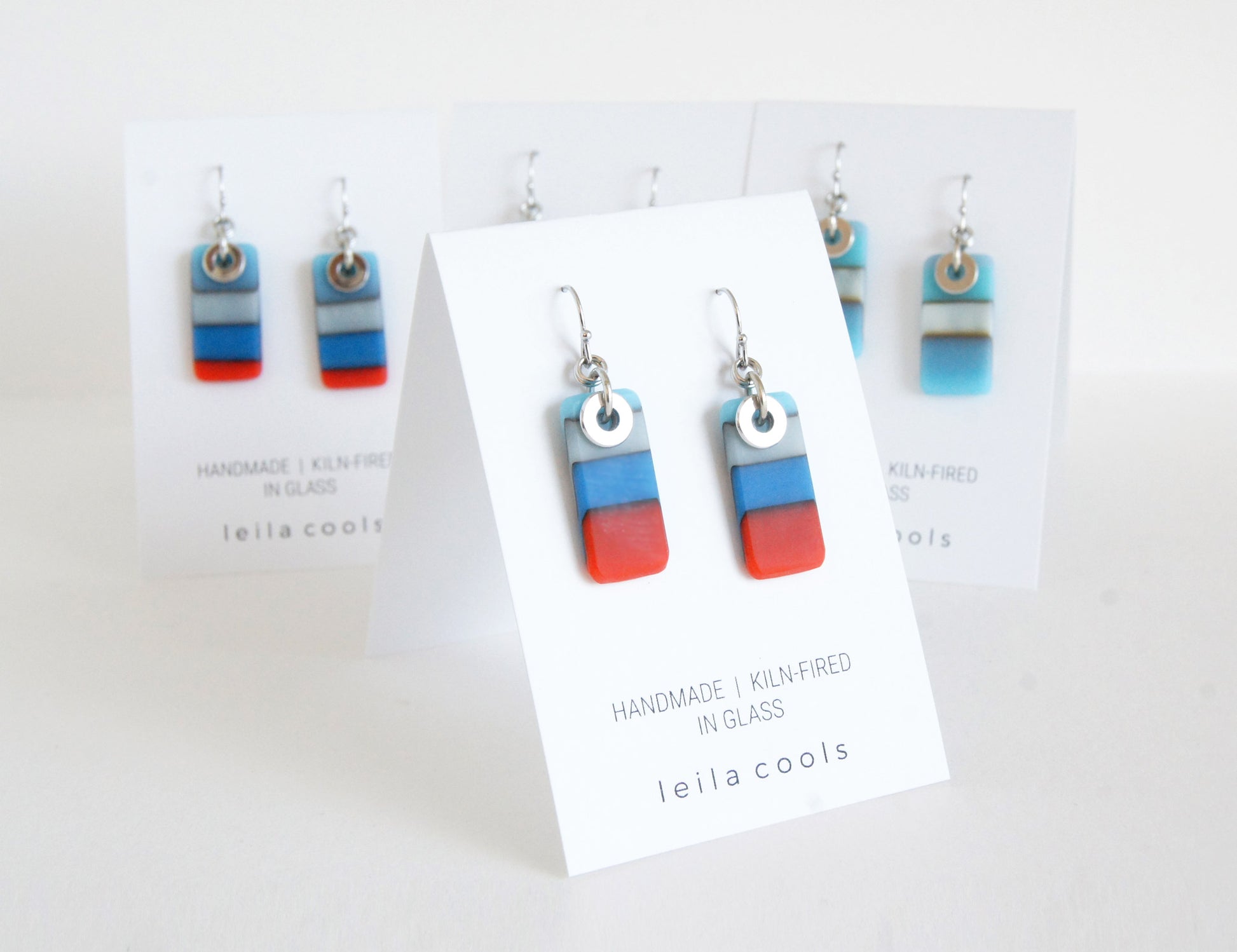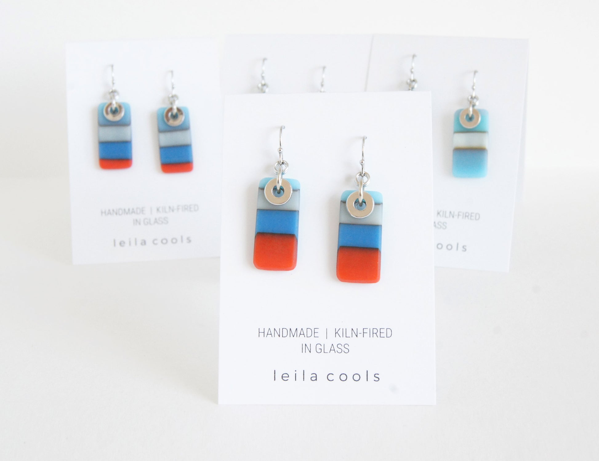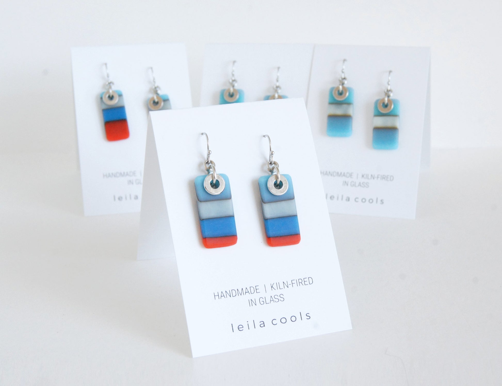 Delicate rectangular earrings individually made in aqua blue, cream. royal blue and red glass with small metal washer beads. Individually handmade.