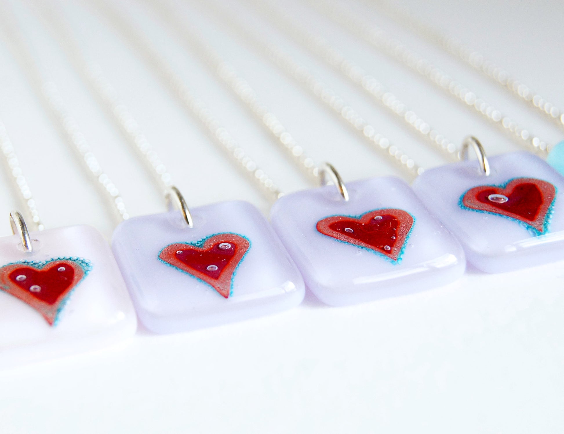 A thin copper heart fused inside layers of glass framed with tiny patina blue bubbles. Individually handmade and kiln-fired.