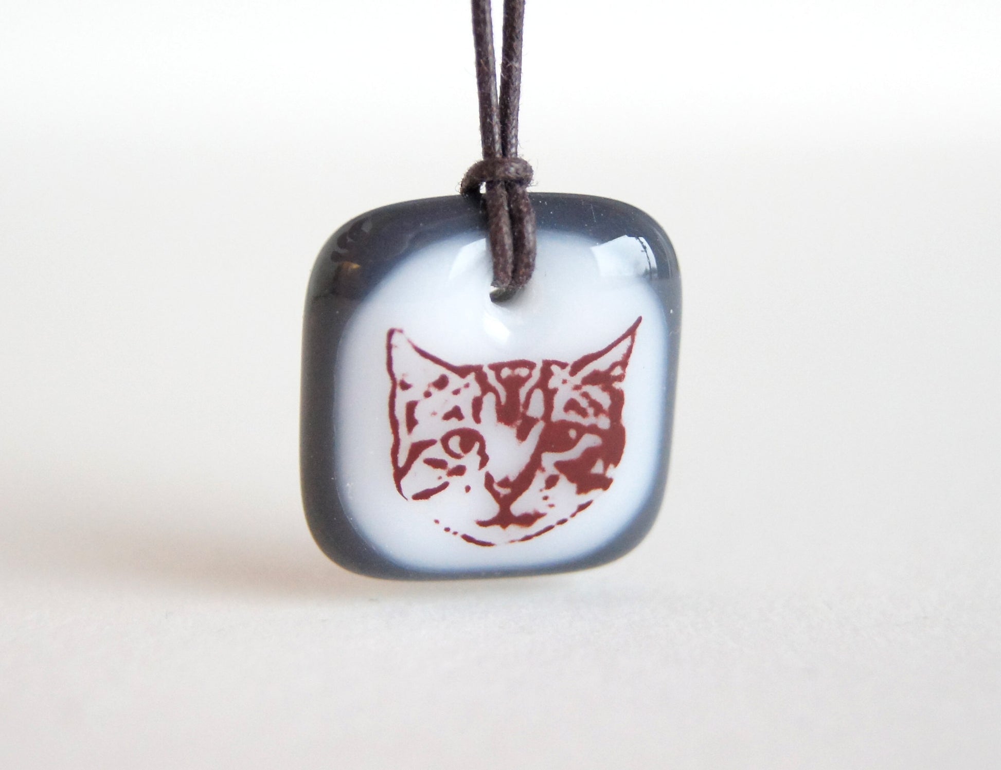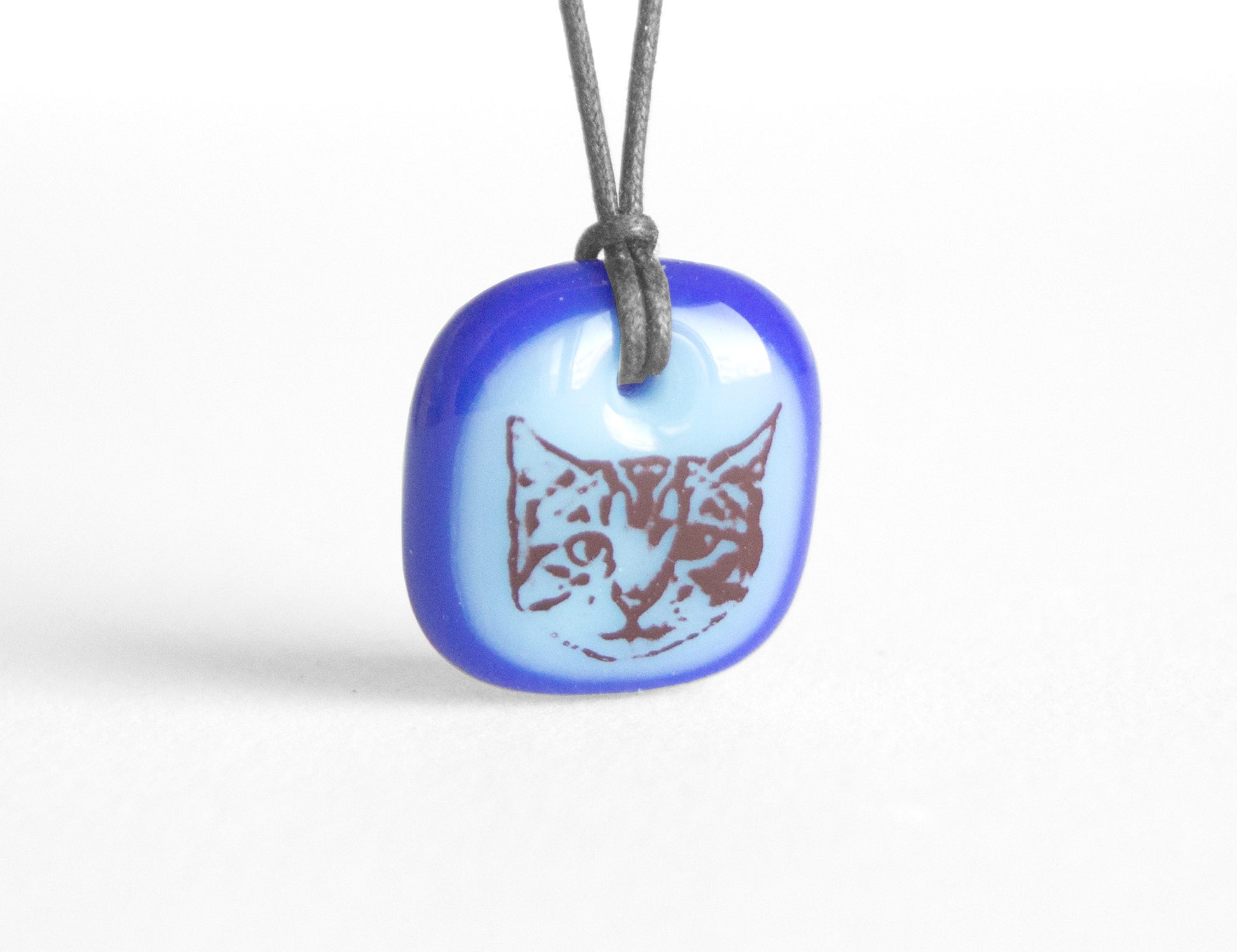 This tabby kitten face necklace was individually made in colourful kiln-fired glass, handmade by Leila Cools.