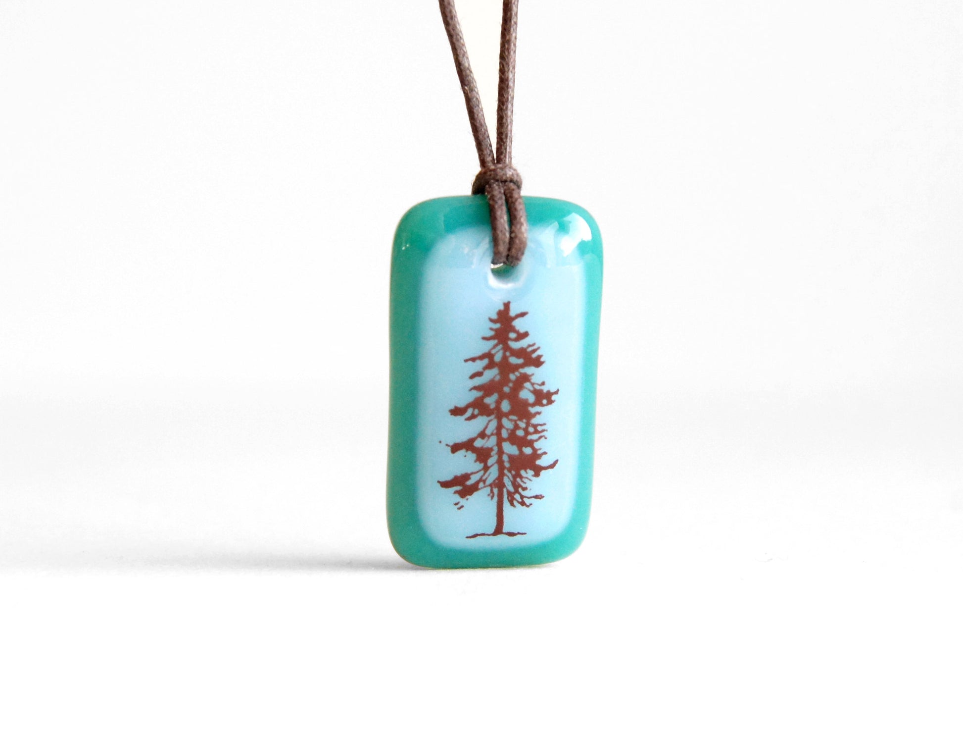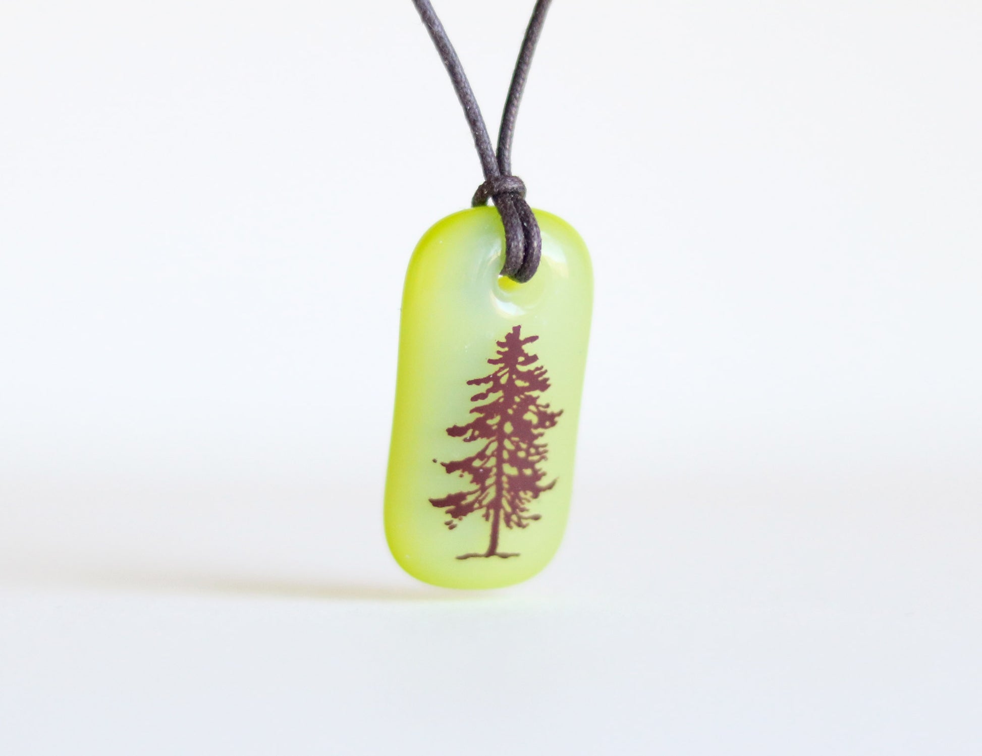 This pine tree necklace was individually made in colourful kiln-fired glass, handmade by Leila Cools.