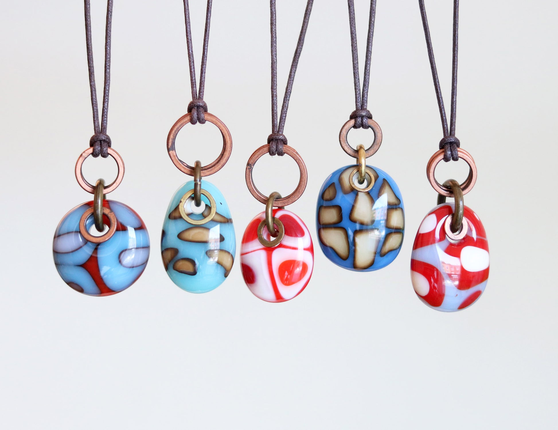 Glass drops with flattened copper and brass discs and rings on a cotton cord necklace. Metals in some of the glass colours interact, creating lines and colour variations where the colours meet. Each glass piece is one of a kind and was individually handmade and kiln fired.