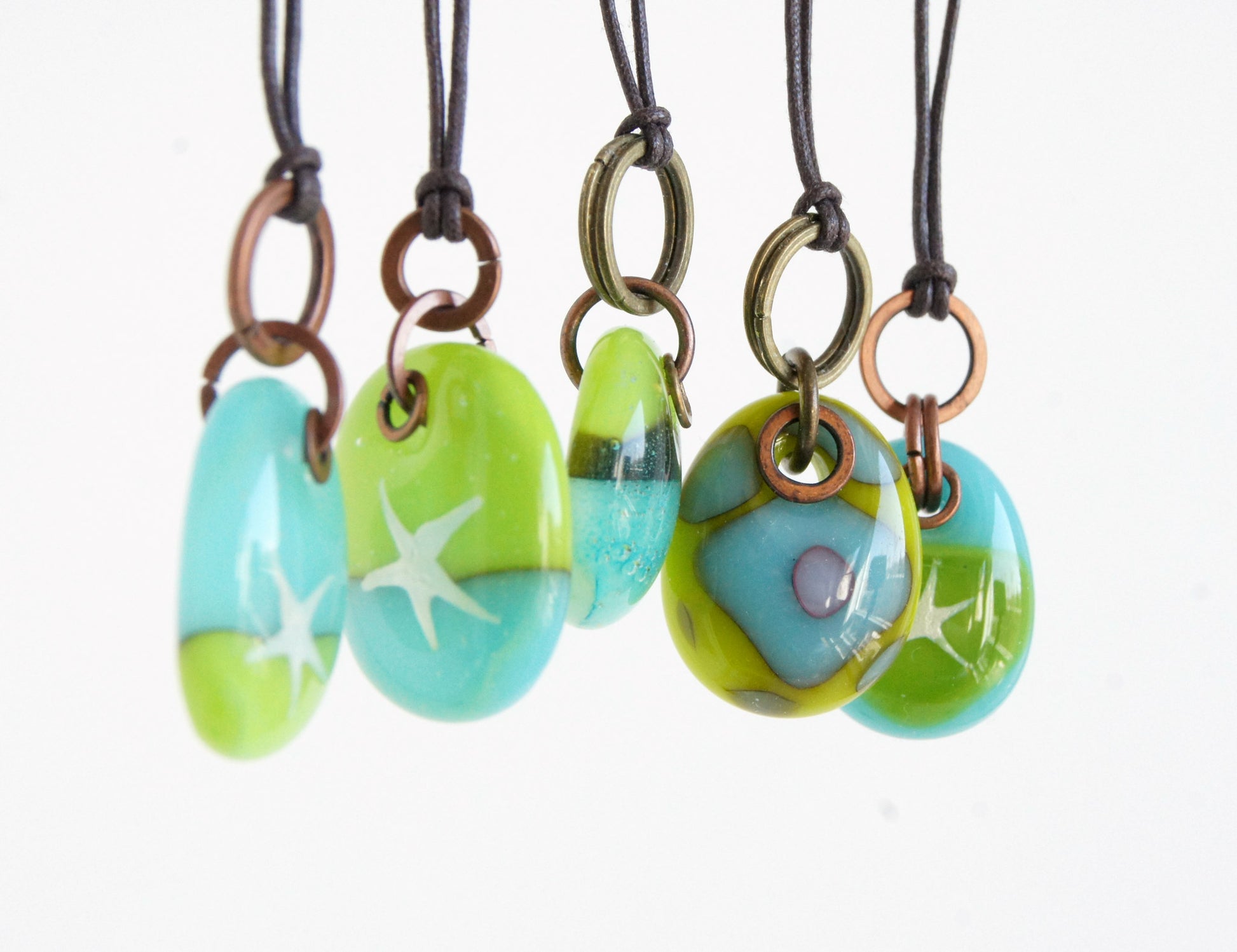 Glass drops with flattened copper and brass discs and rings on a cotton cord necklace. Each glass piece is one of a kind and was individually handmade and kiln fired.