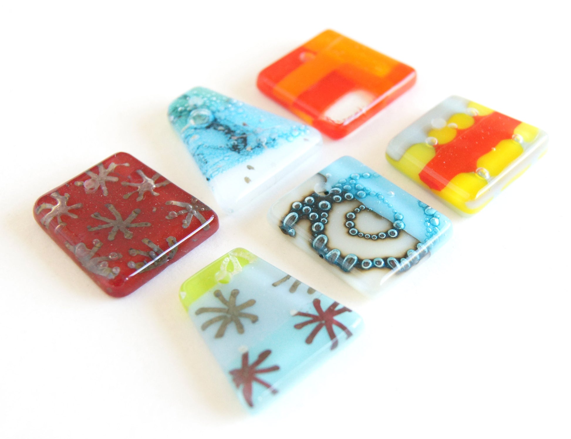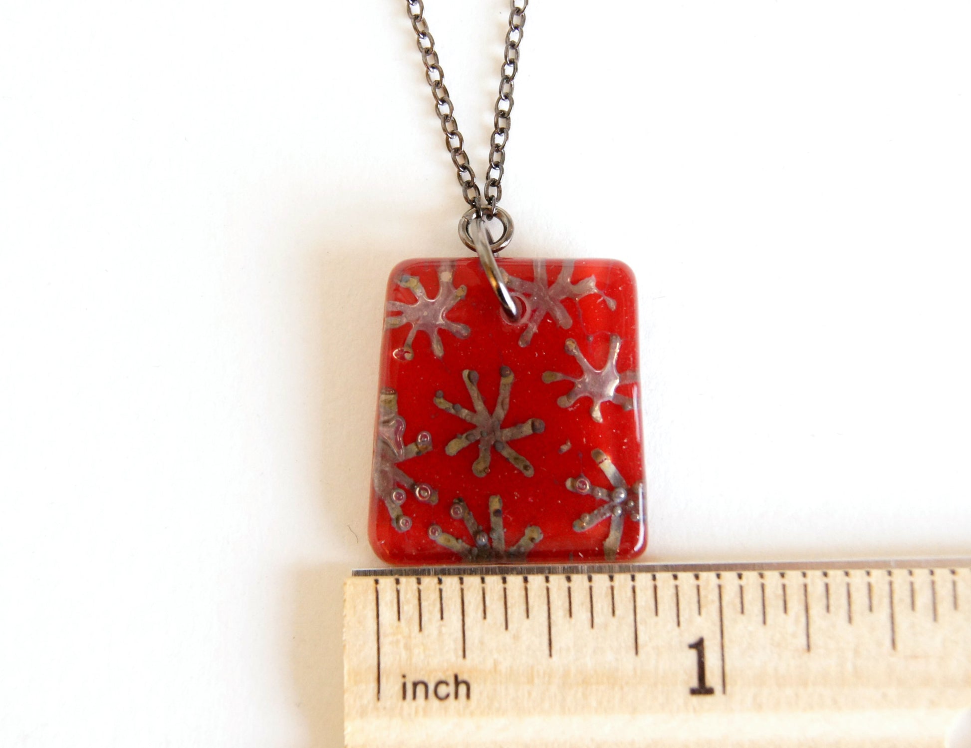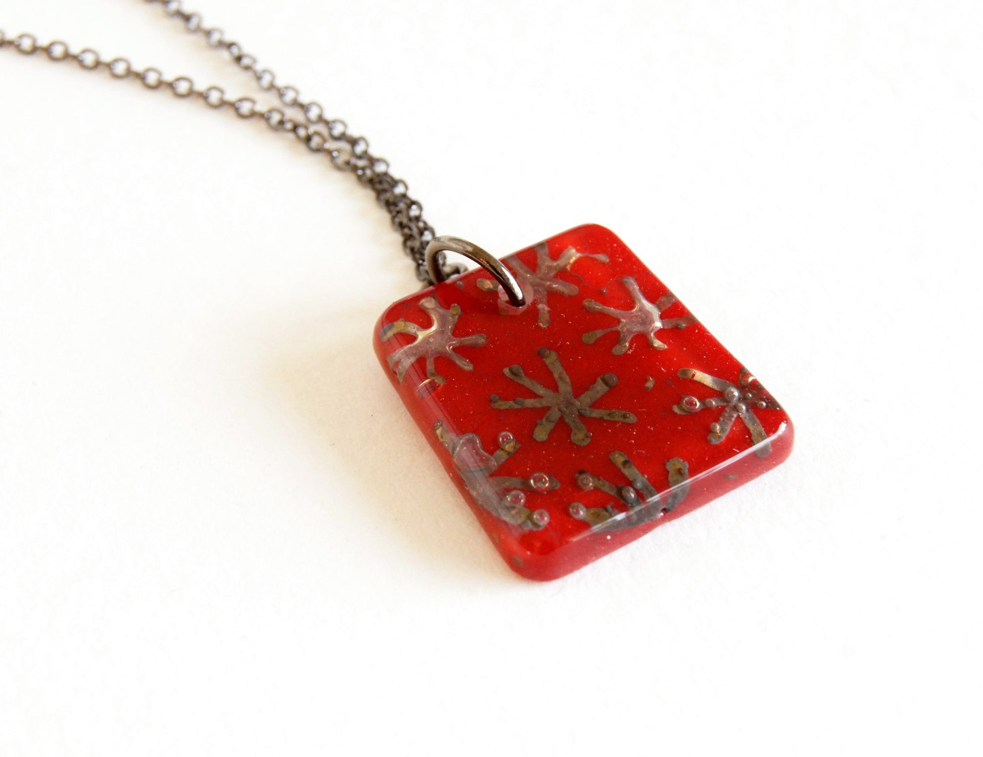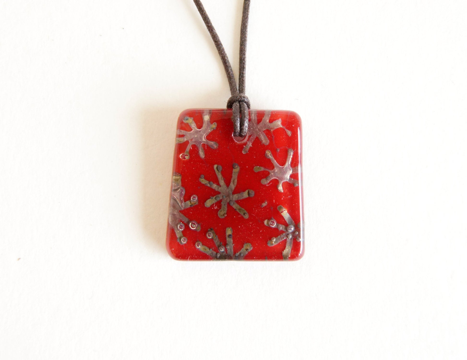 This necklace is part of a limited series of single, one-of-a-kind kiln-fired fused glass pendant necklaces. Each is from a mini-batch and so there may be similar necklaces from the same batch in different shapes and sizes.
