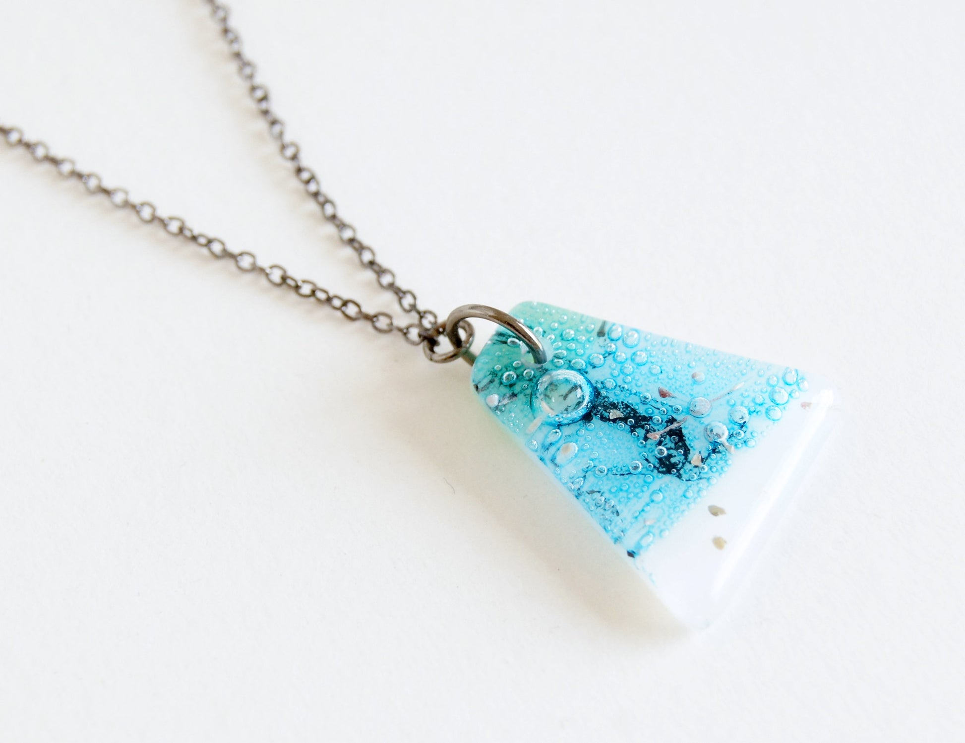 This necklace is part of a limited series of single, one-of-a-kind kiln-fired fused glass pendant necklaces. Each is from a mini-batch and so there may be similar necklaces from the same batch in different shapes and sizes.