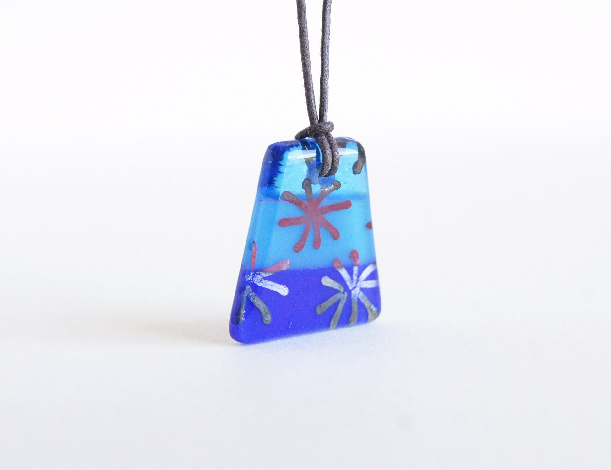 This necklace is part of a limited series of single, one-of-a-kind kiln-fired fused glass pendant necklaces. Each is from a mini-batch and so there may be similar necklaces from the same batch in different shapes and sizes.