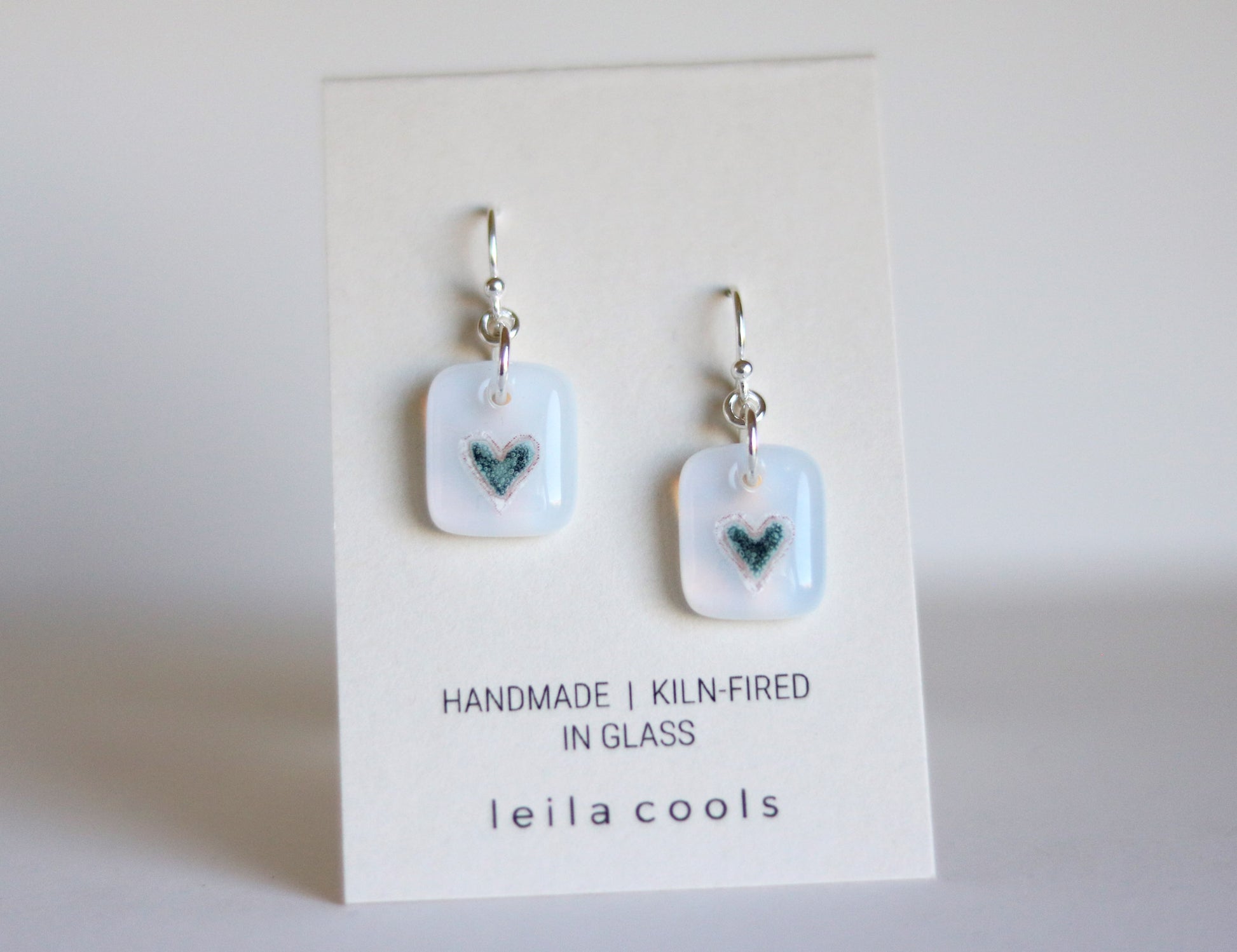 Delicate glass earrings with little hearts. Individually kiln-fired and shaped in my studio.