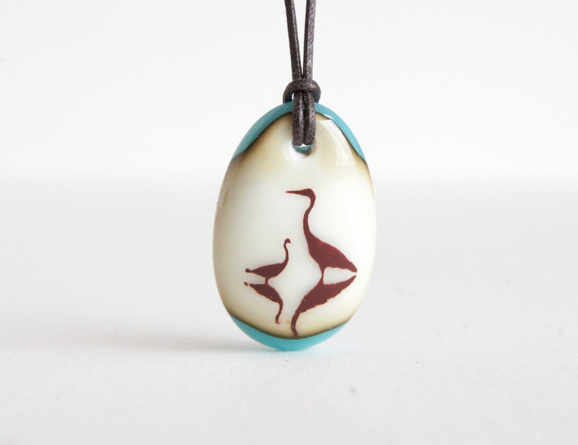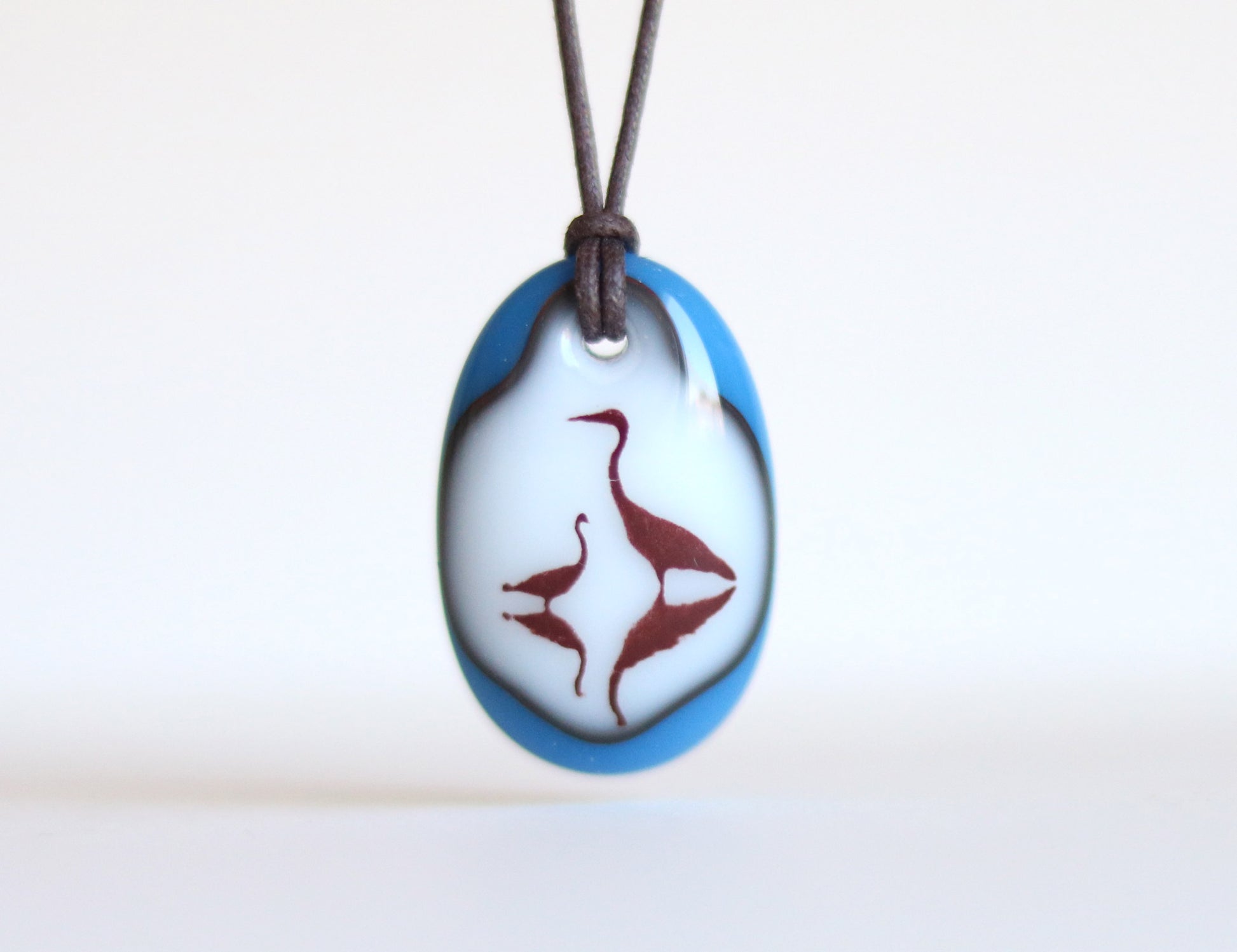 This herons necklace was individually made in colourful kiln-fired glass, handmade by Leila Cools.
