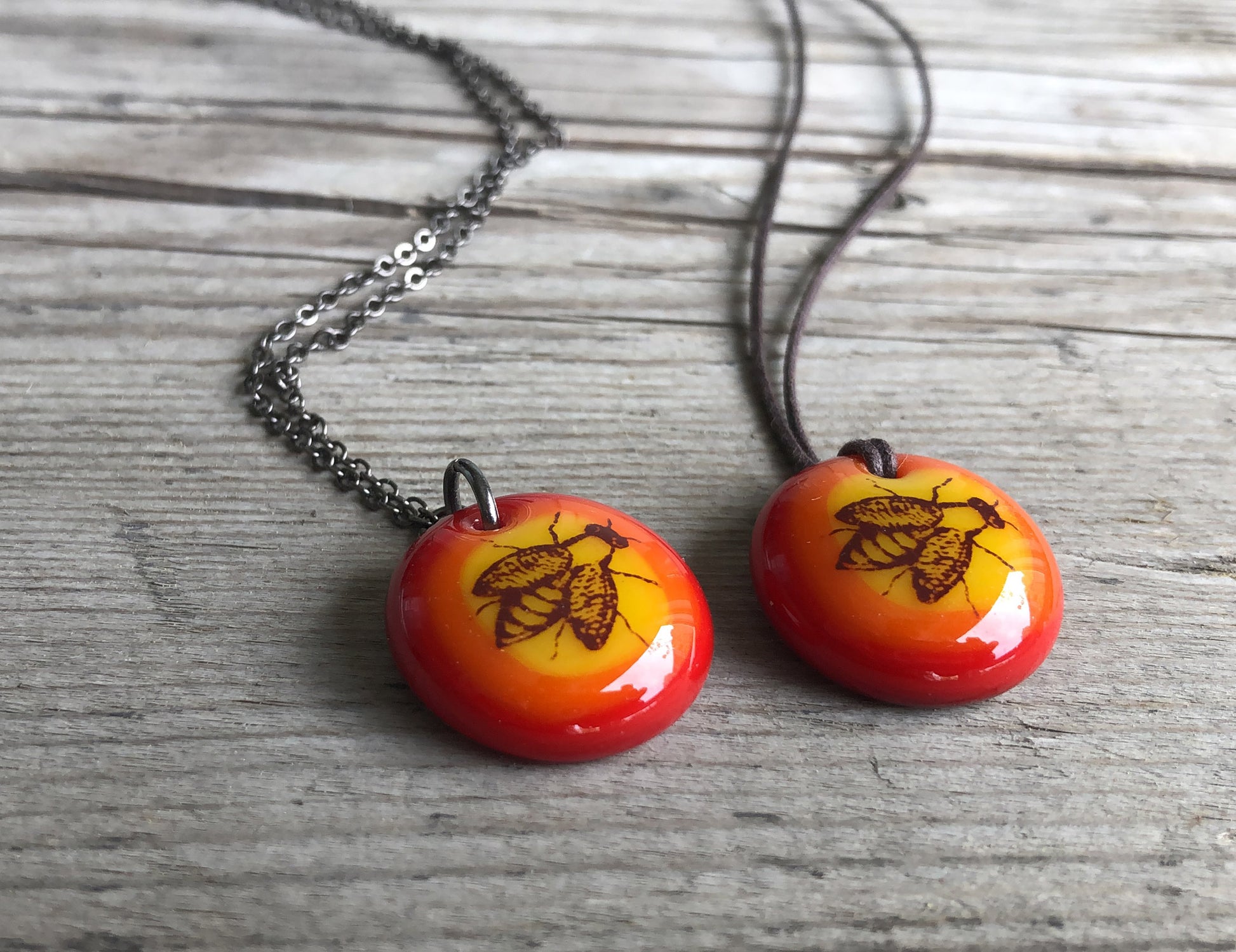 This honey bee necklace was individually made in colourful kiln-fired glass, handmade by Leila Cools.