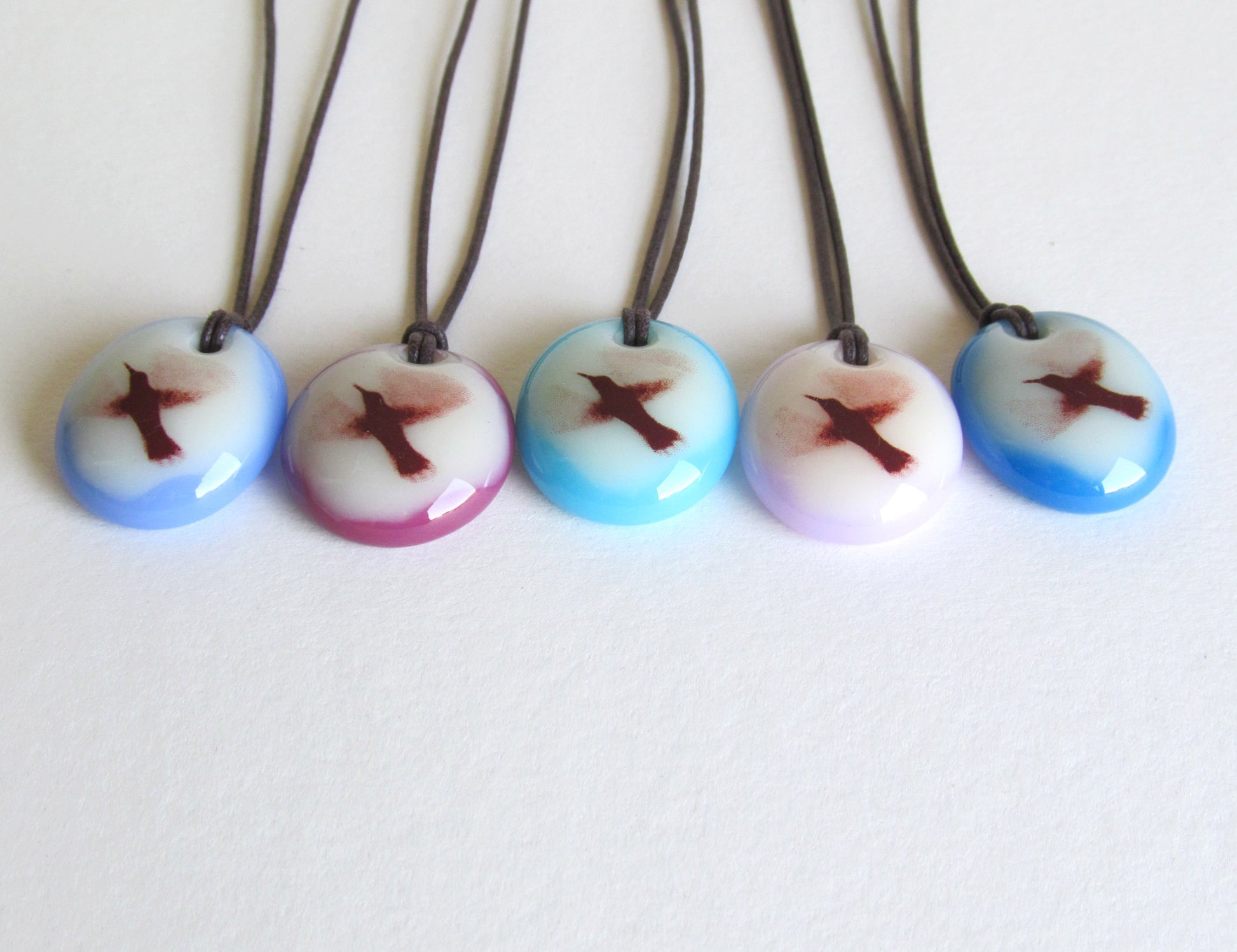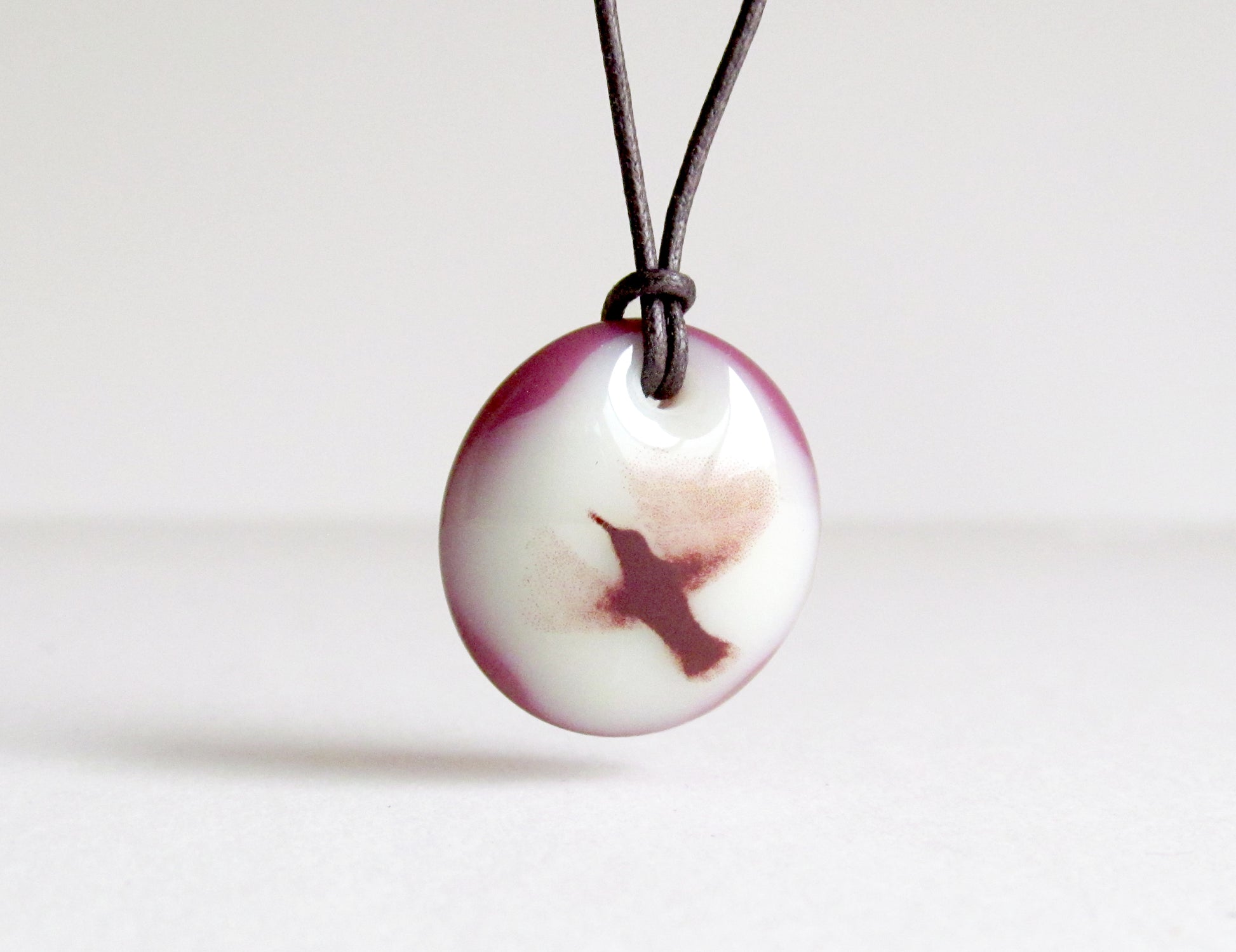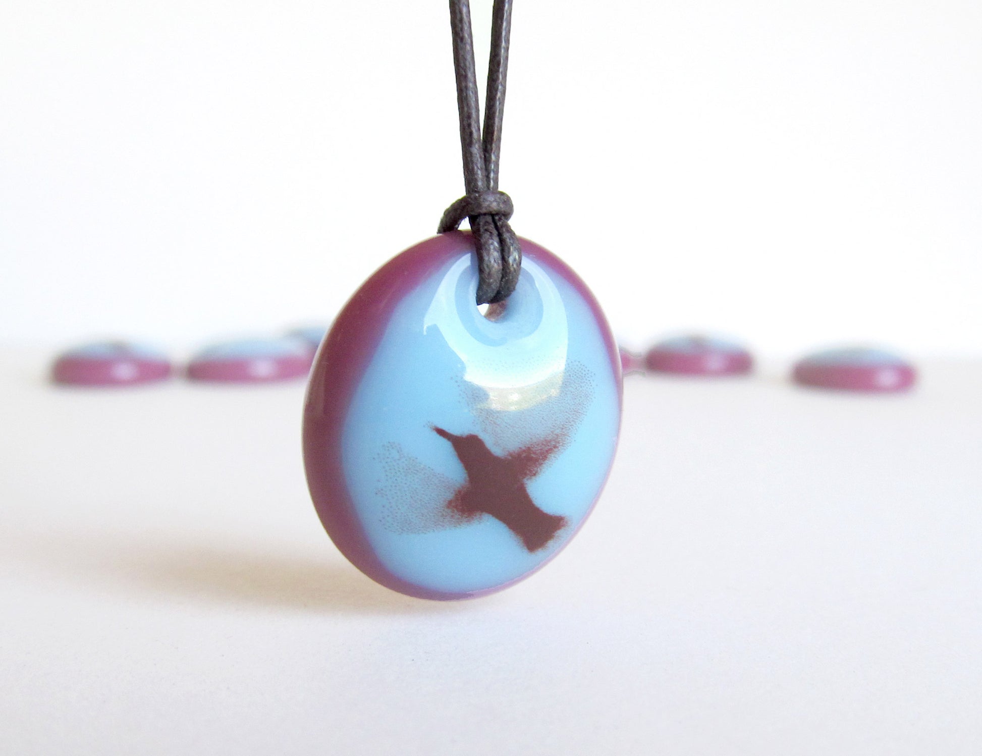 This hummingbird necklace was individually made in colourful kiln-fired glass, handmade by Leila Cools.