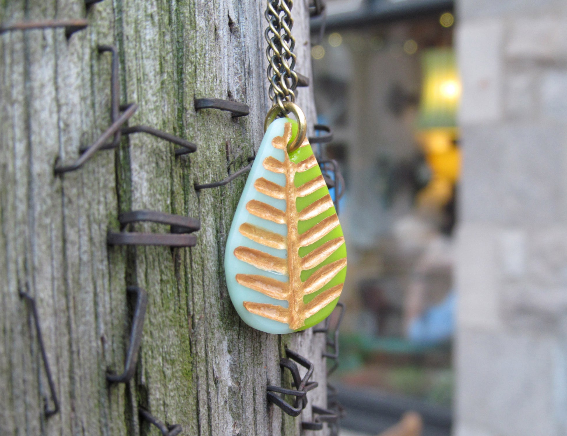 A pressed glass pendant with a leaf shape and design highlighted with permanent gold paint. The edges and front are polished to a matte finish.