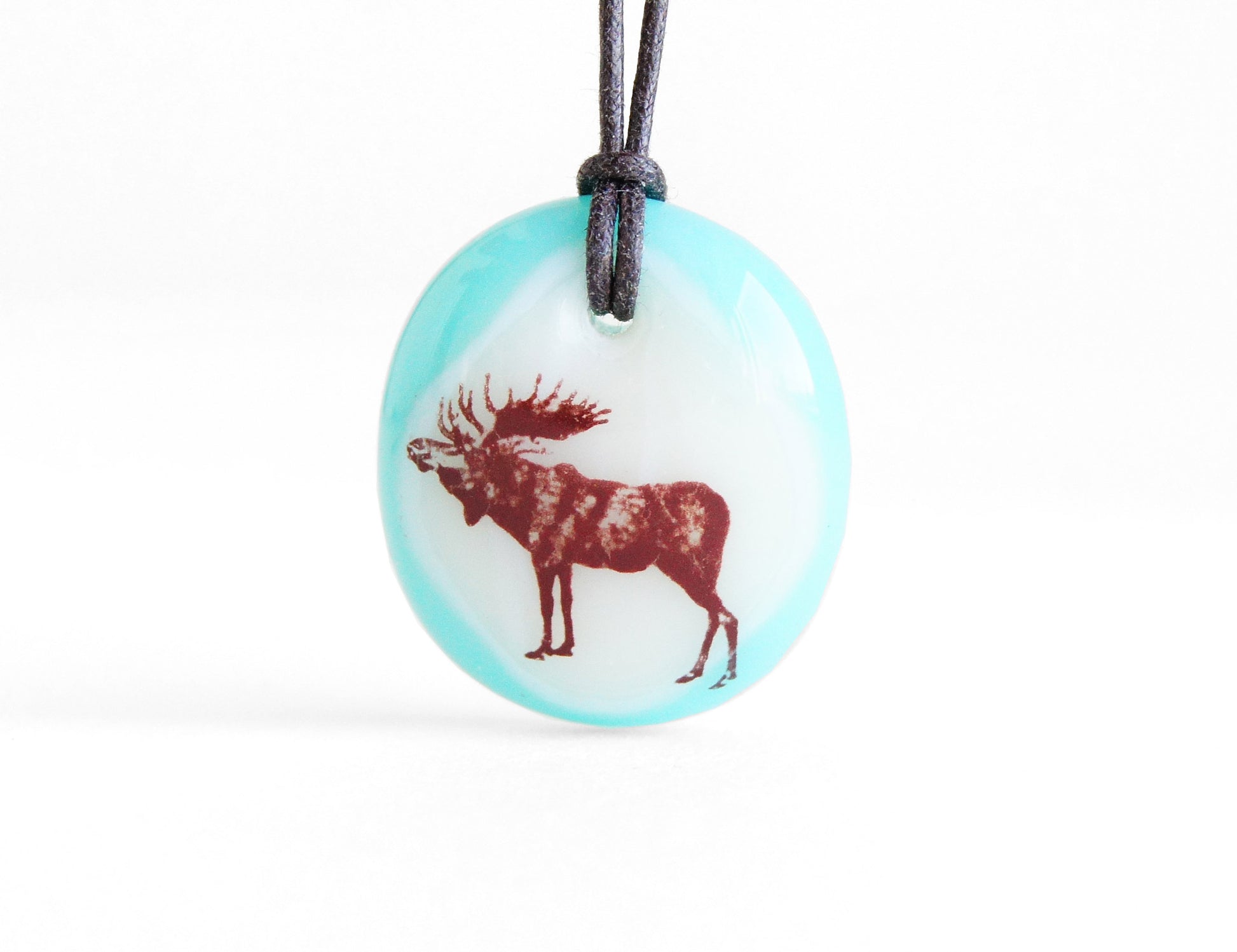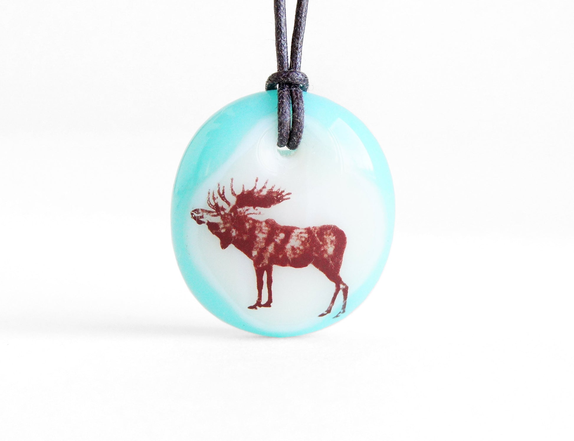 This moose necklace was individually made in colourful kiln-fired glass, handmade by Leila Cools.
