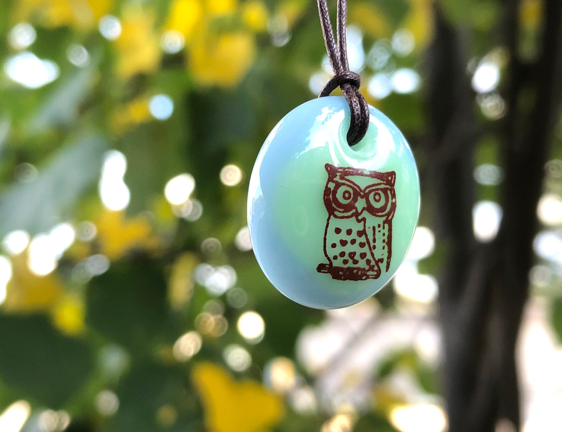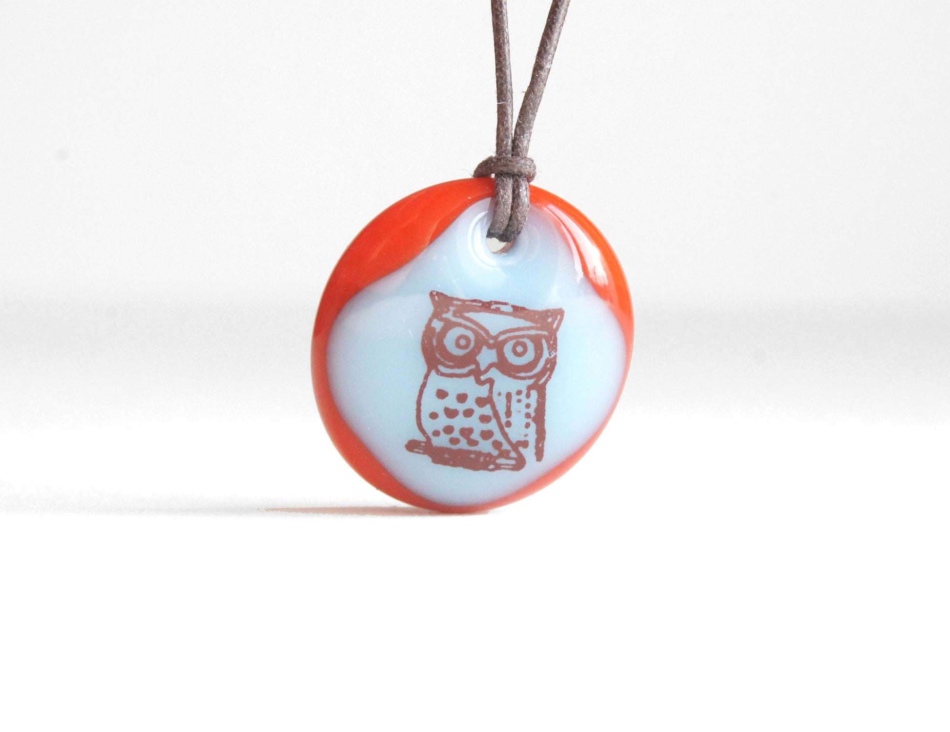 This owl necklace was individually made in colourful kiln-fired glass, handmade by Leila Cools.