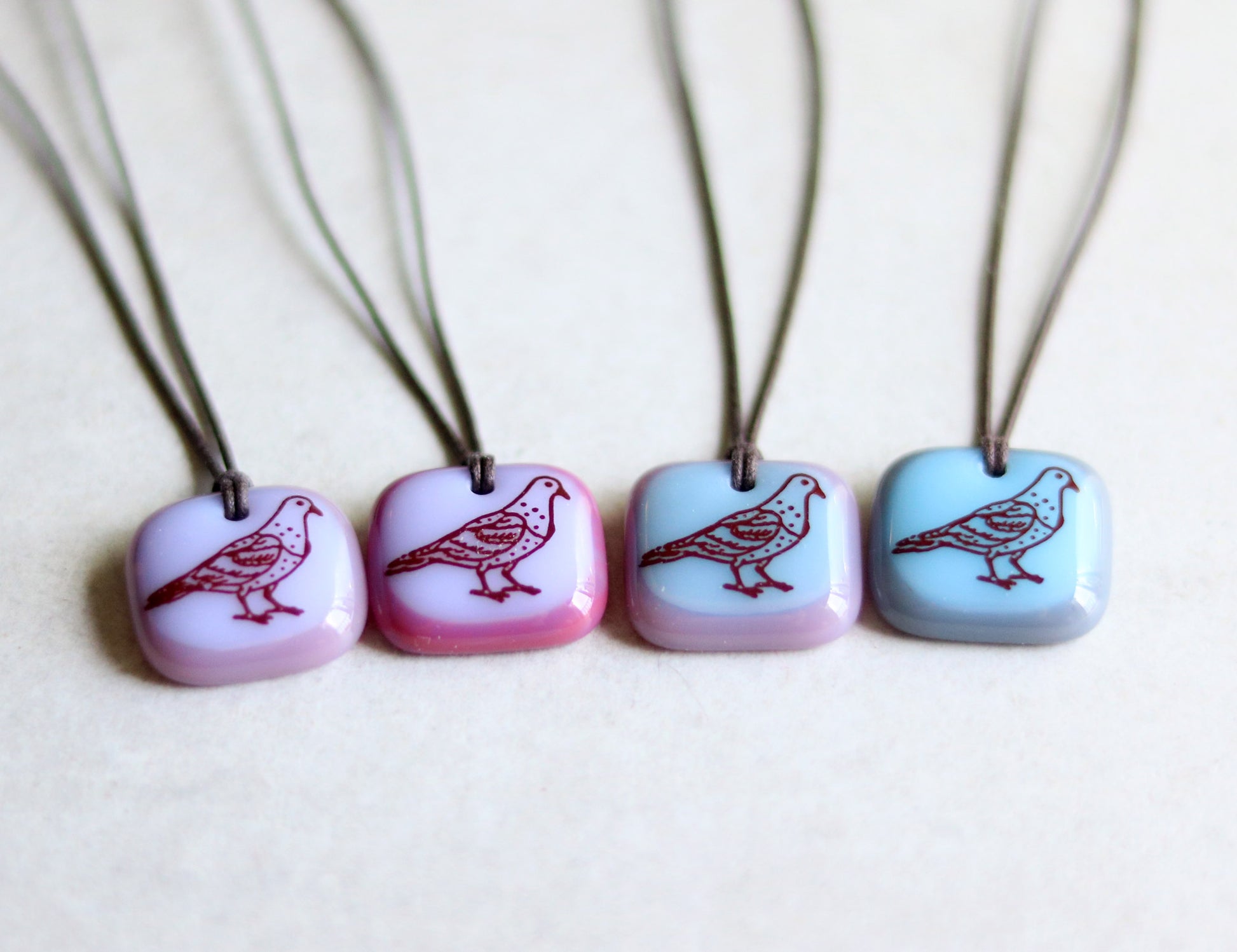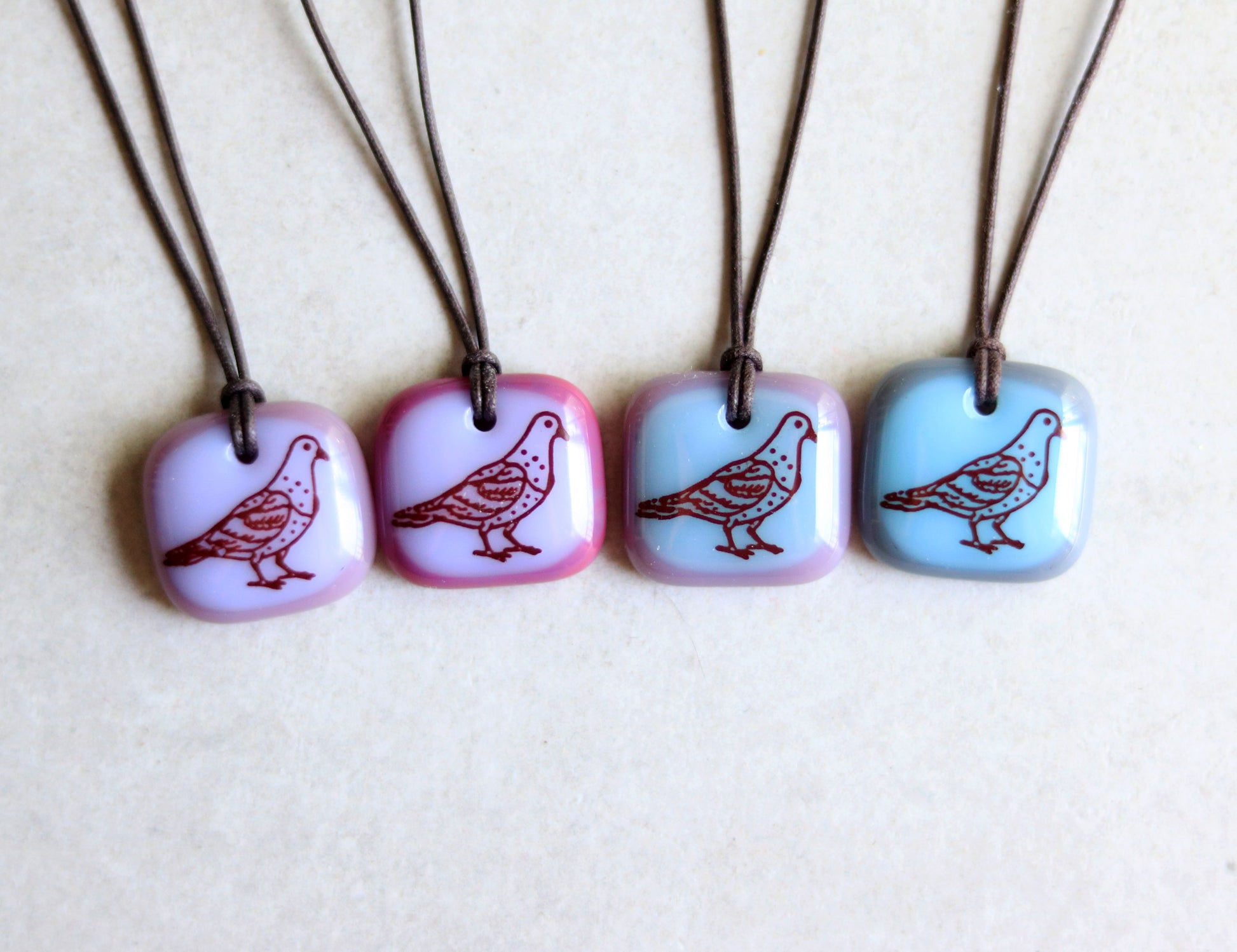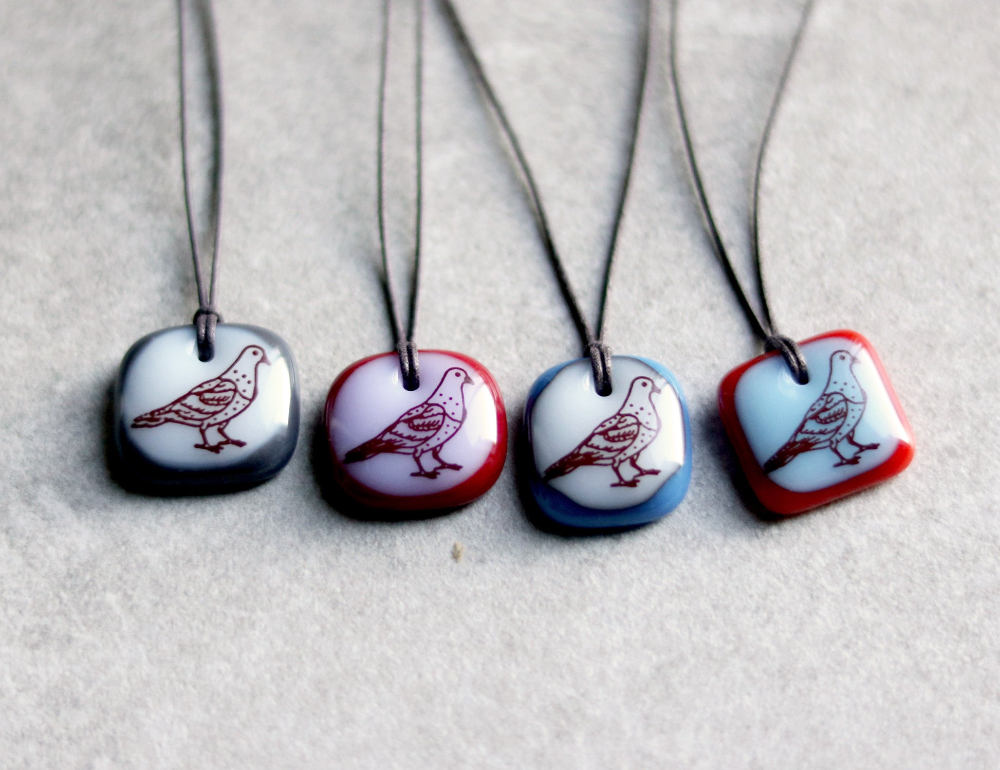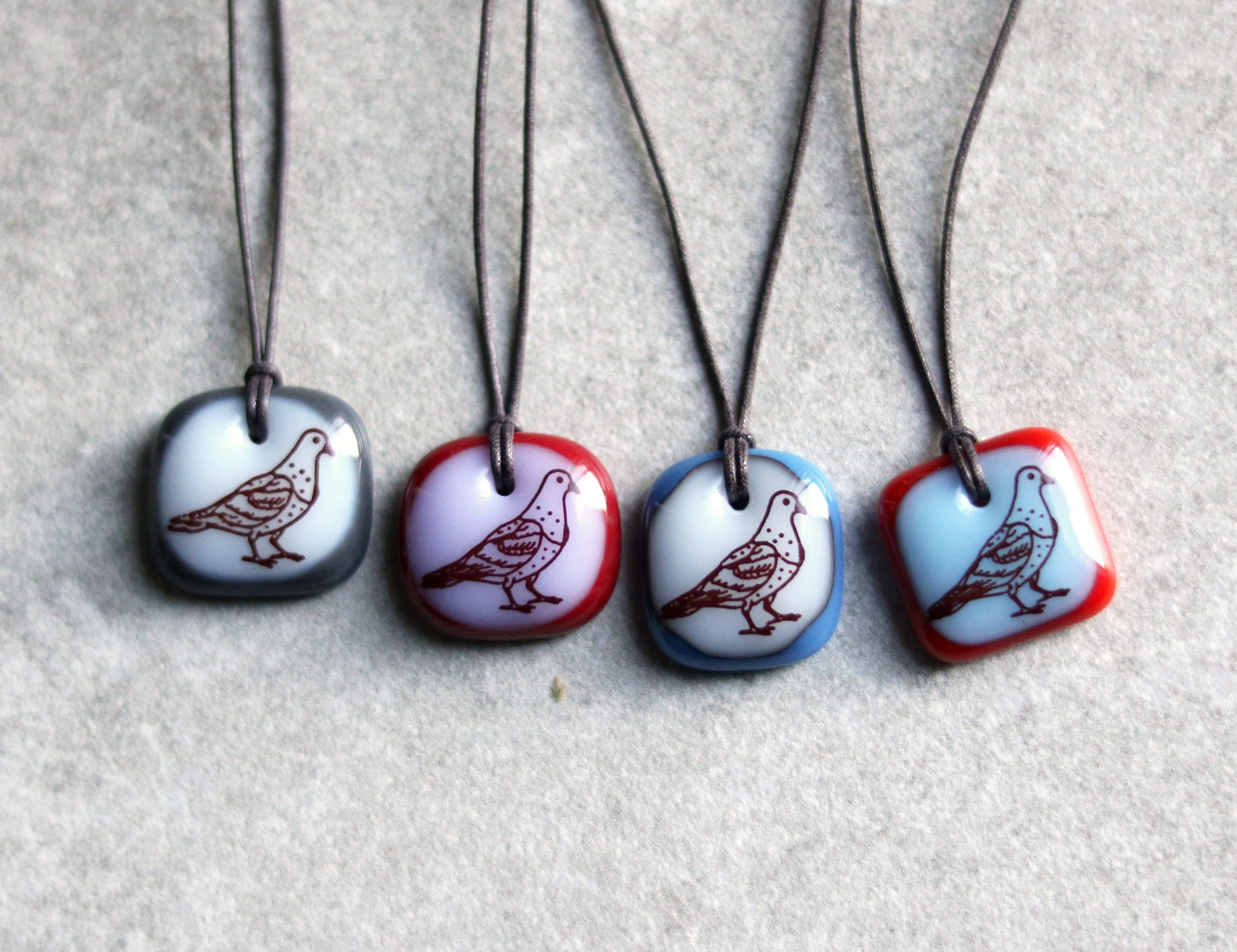 This pigeon necklace was individually made in colourful kiln-fired glass, handmade by Leila Cools.