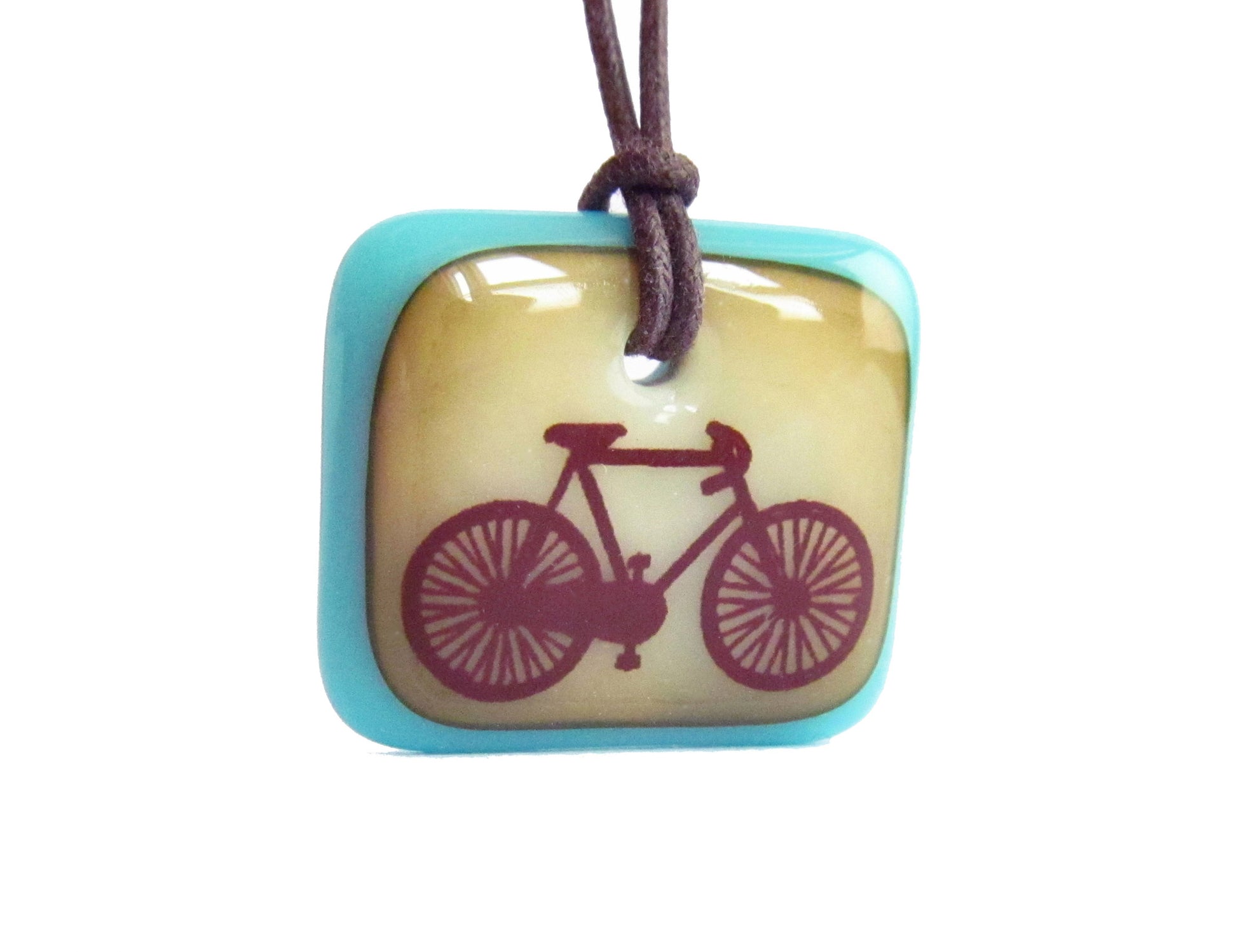 A bicycle image permanently fused to a kiln-fired handmade glass pendant necklace, handmade by Leila Cools.