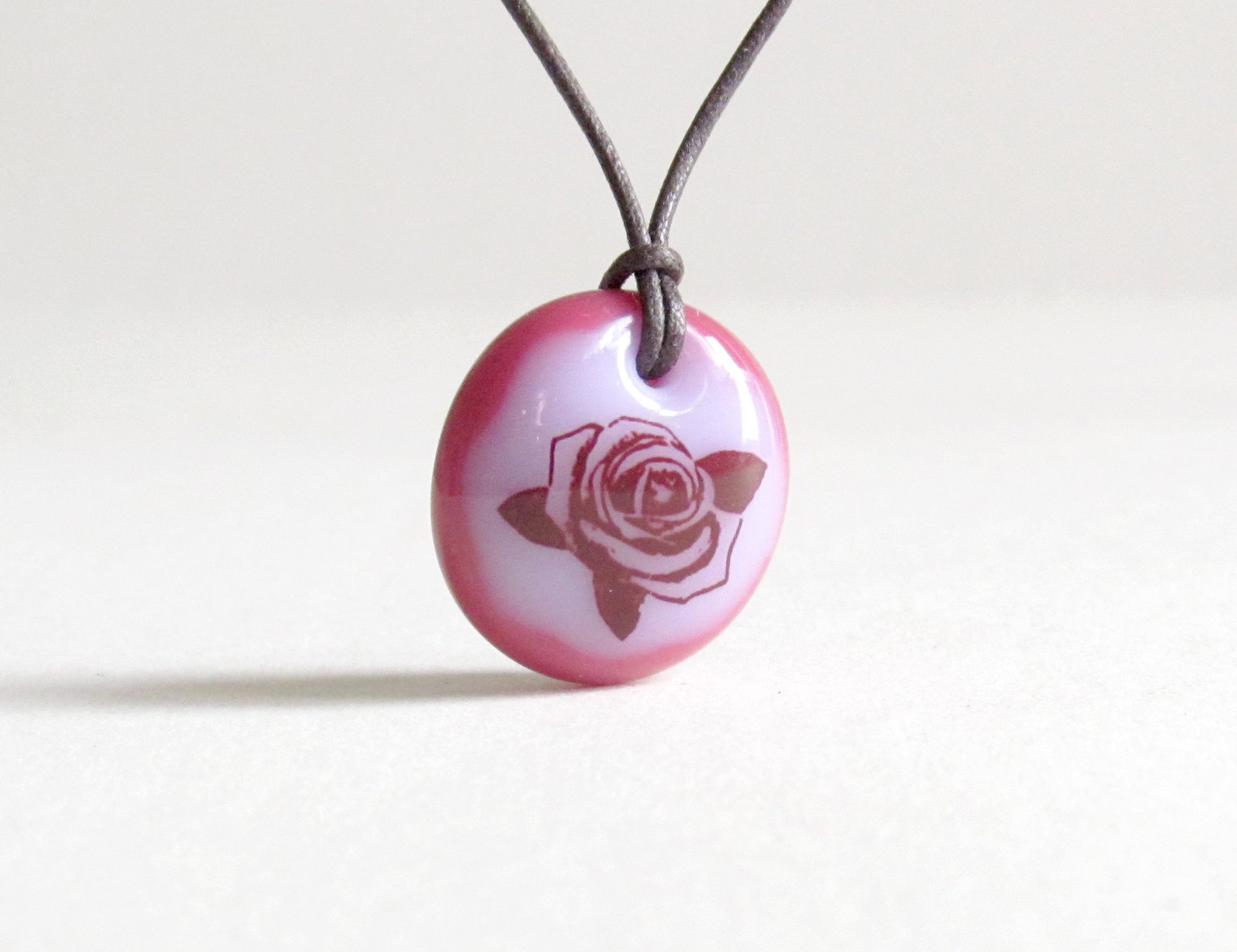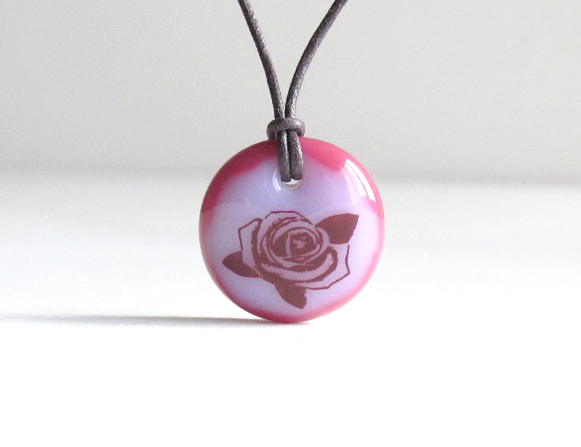 An illustration of a rose permanently fused to a kiln-fired glass pendant necklace, handmade by Leila Cools.