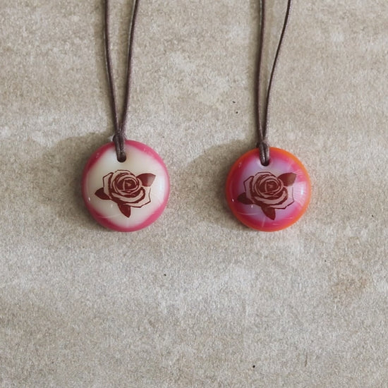 An illustration of a rose permanently fused to a kiln-fired glass pendant necklace, handmade by Leila Cools.