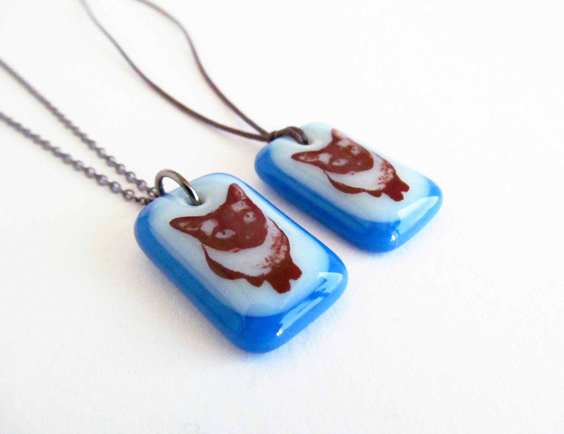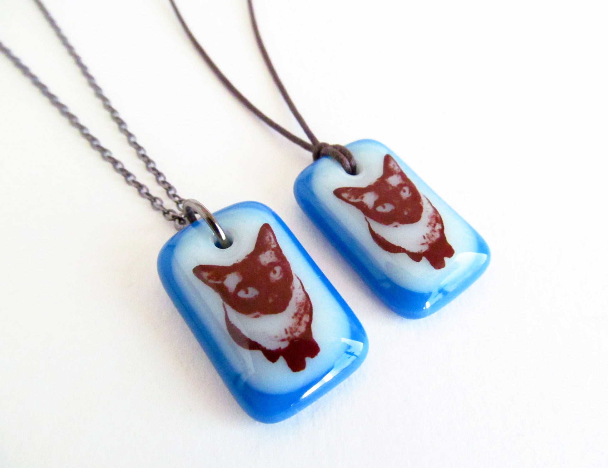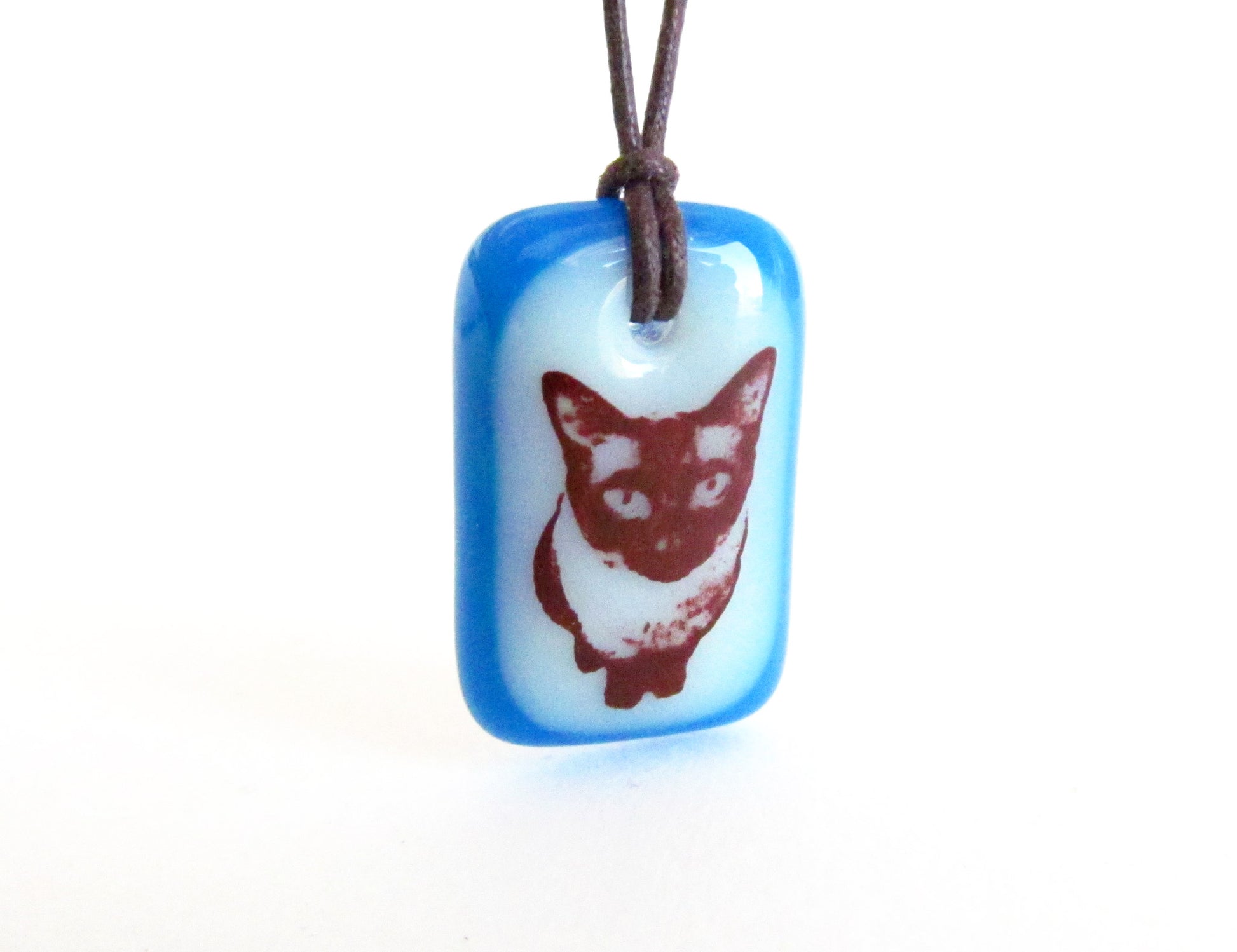A photographic image of a Siamese cat is permanently fused to a kiln-fired handmade glass pendant necklace, handmade by Leila Cools.