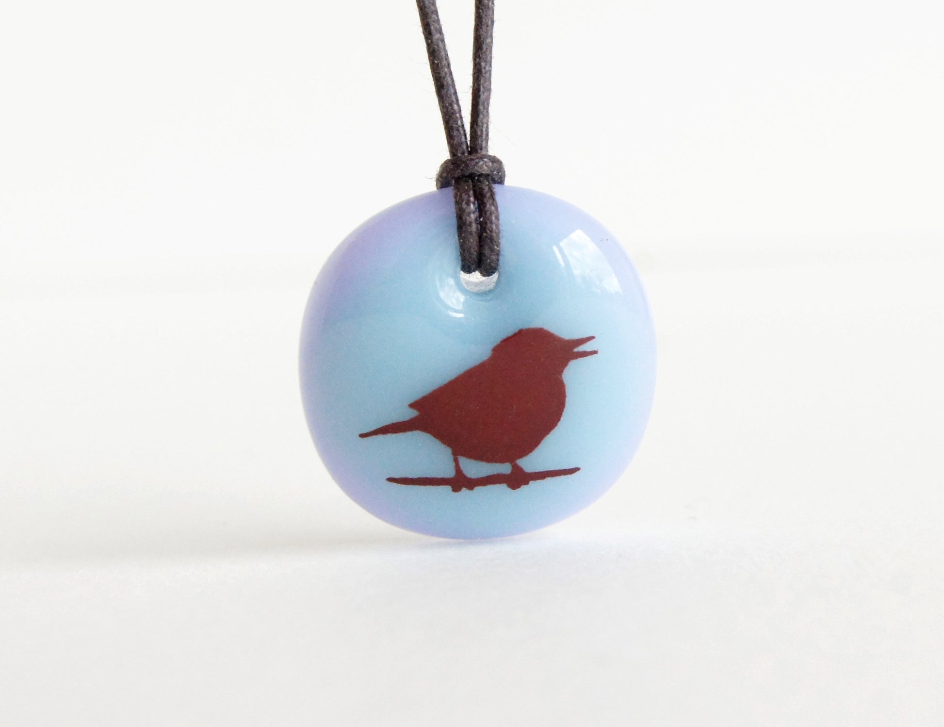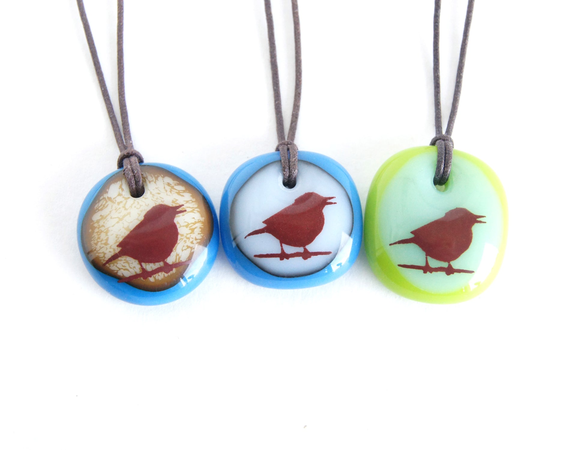 The bird image is permanently fused to the kiln-fired handmade glass pendant necklace, handmade by Leila Cools.