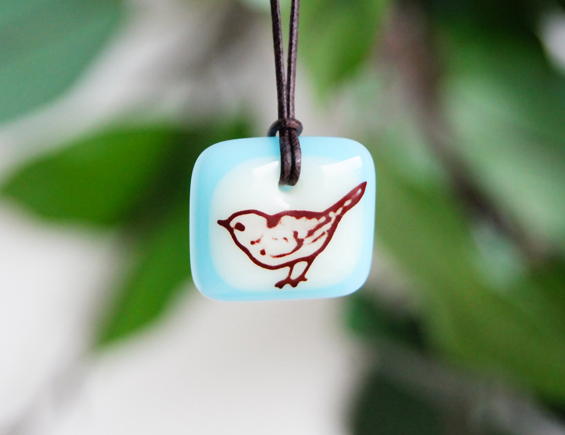Songbird Necklace. A sweet bird illustration fused onto this kiln-fired glass pendant necklace. Handmade by Leila Cools.
