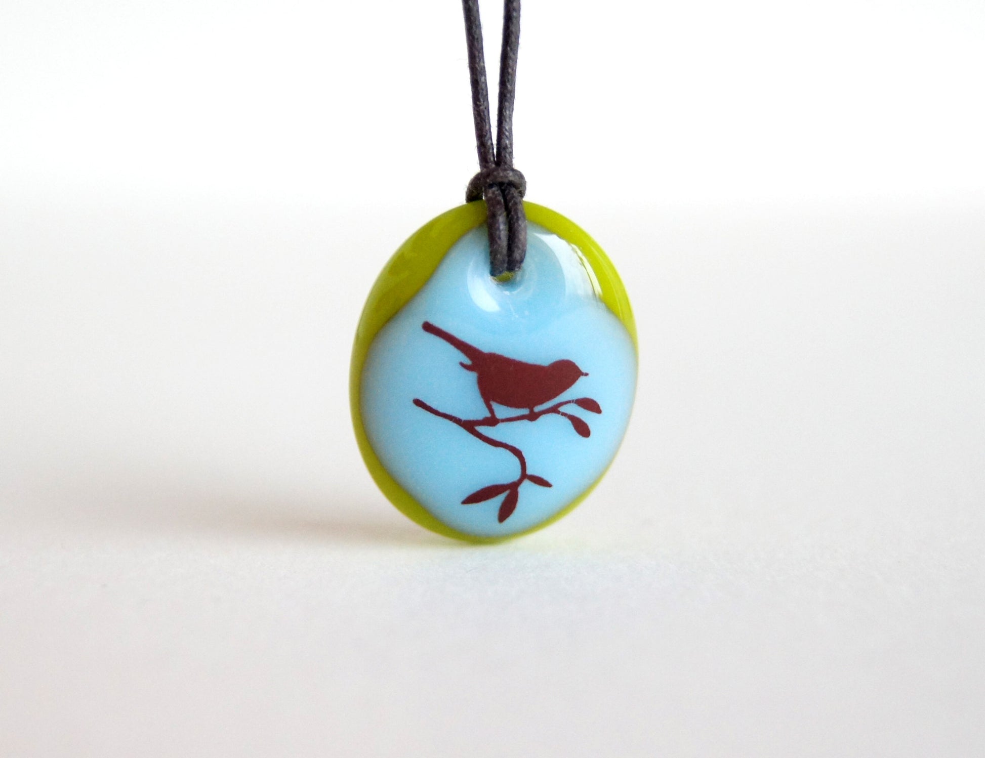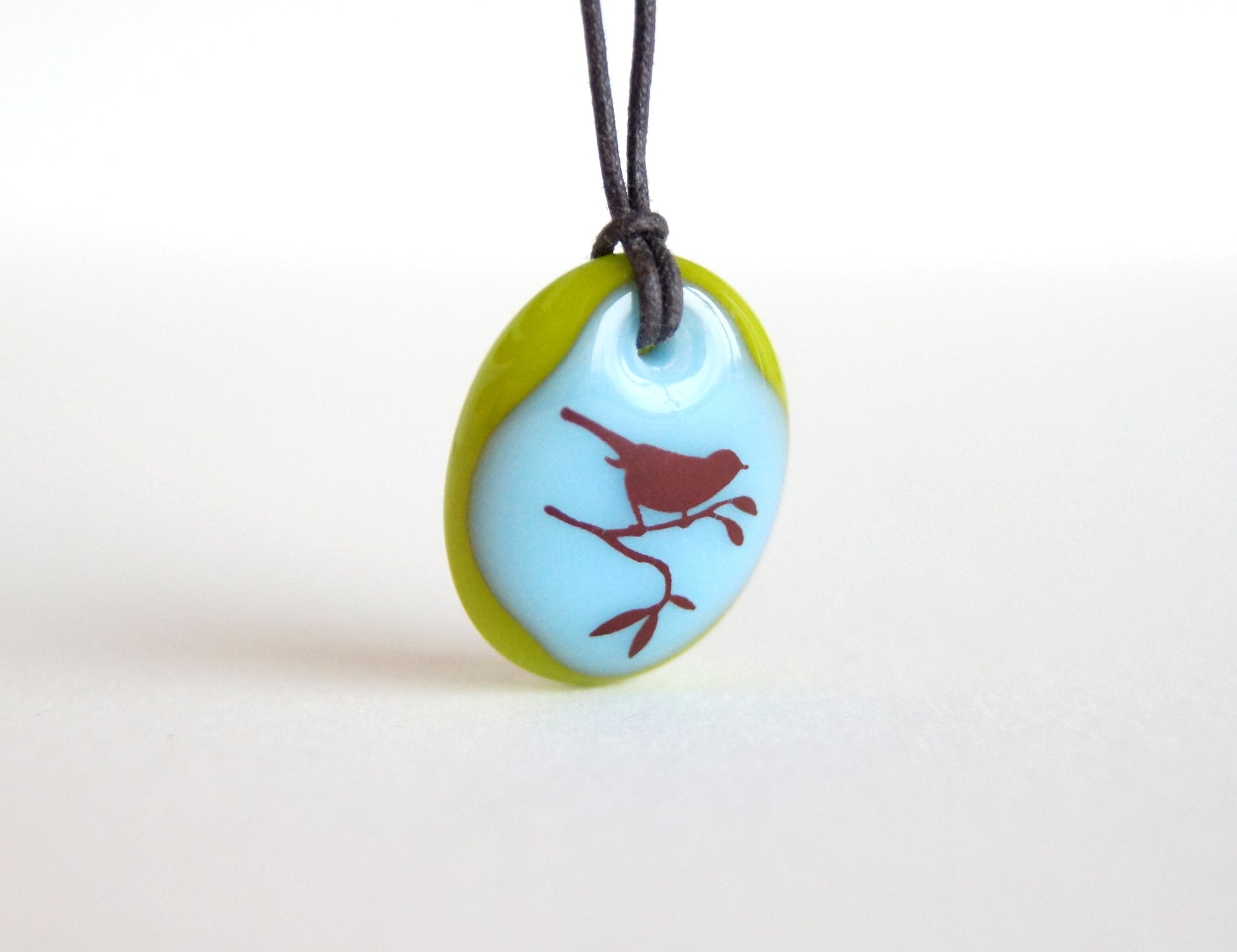 A bird image permanently fused to a kiln-fired handmade glass pendant necklace, handmade by Leila Cools.