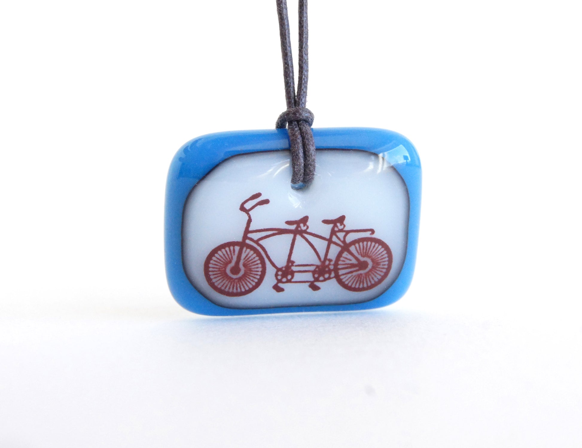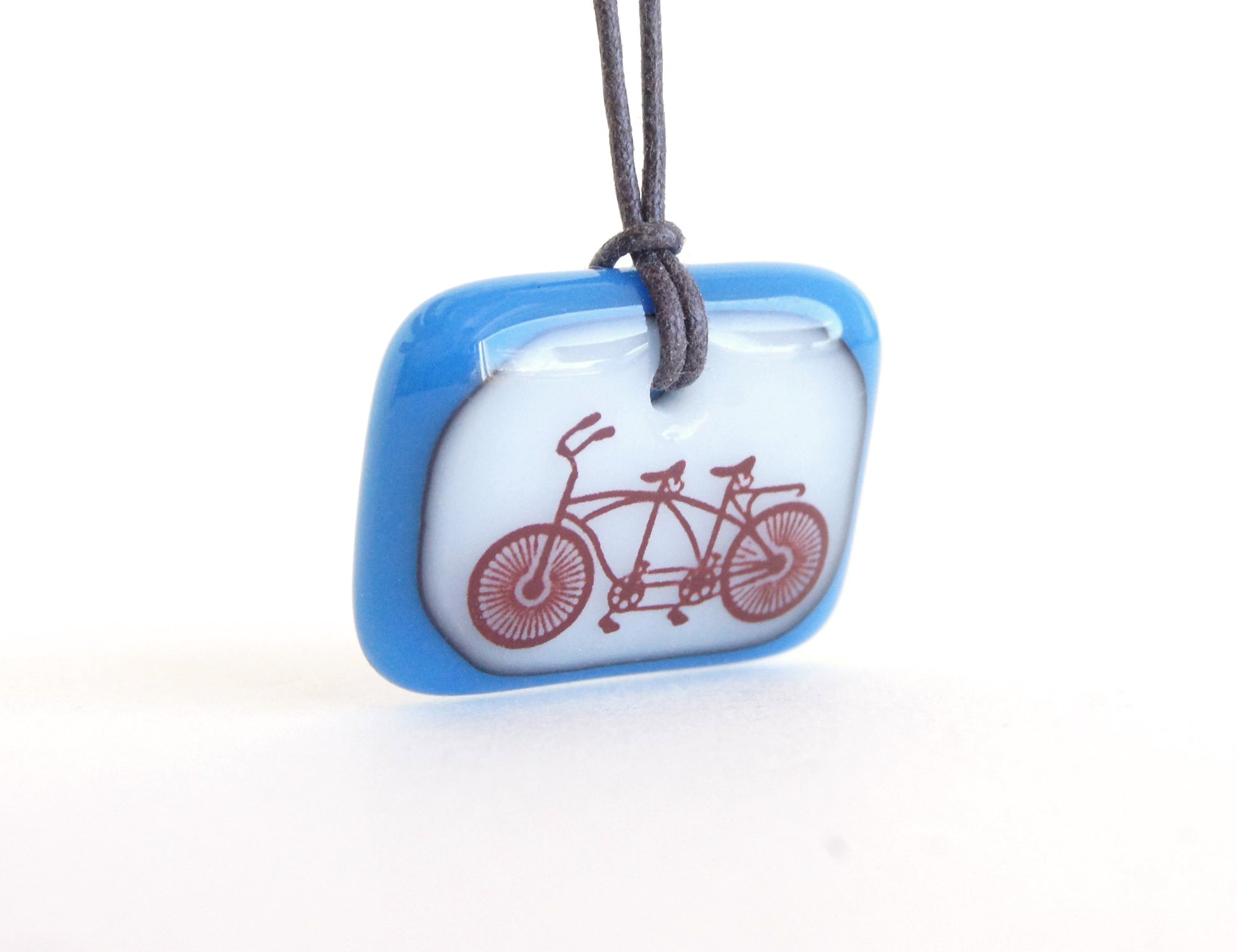 A tandem bike illustration permanently fused to a kiln-fired handmade glass pendant necklace, handmade by Leila Cools.