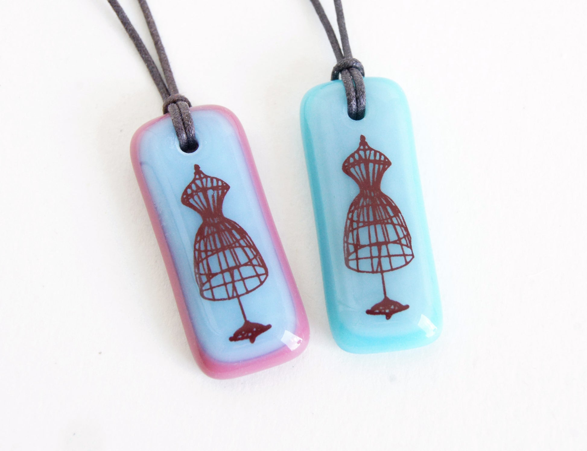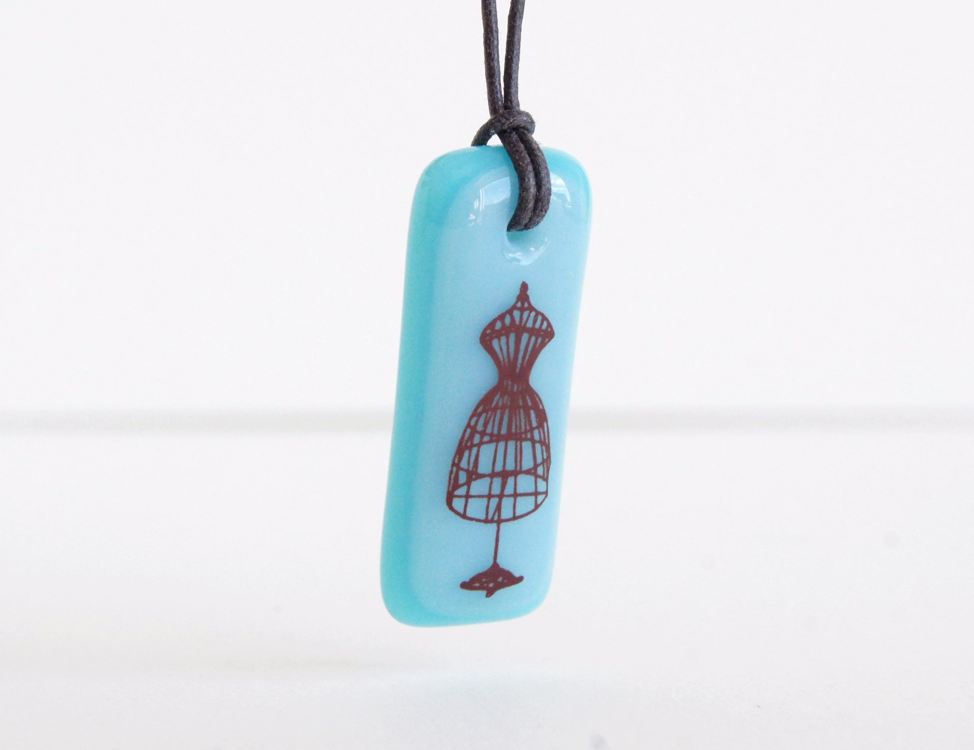 An illustration of a vintage dress form permanently fused to this kiln-fired handmade glass pendant necklace, handmade by Leila Cools.