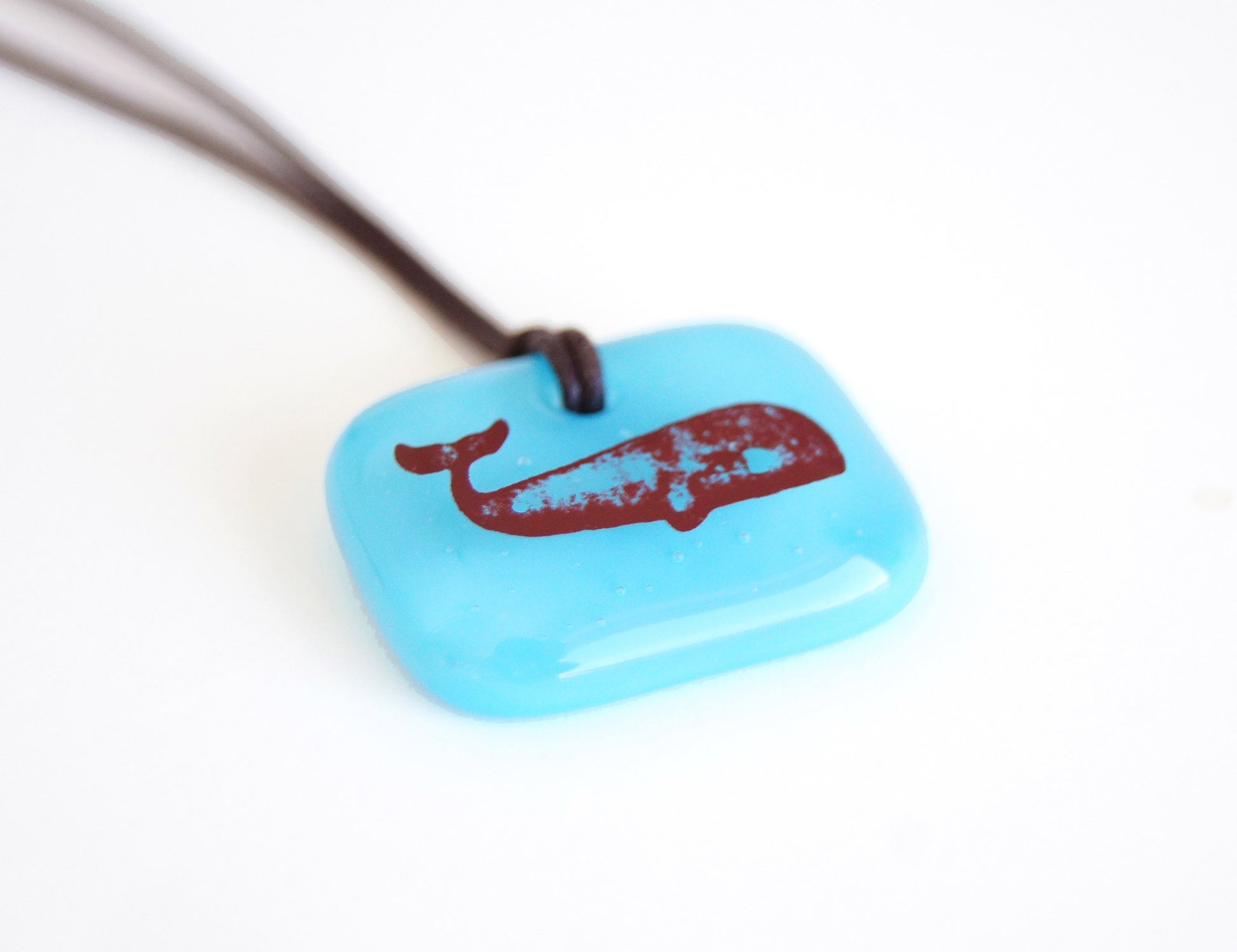 A whale illustration permanently fused to a kiln-fired handmade glass pendant necklace, handmade by Leila Cools.