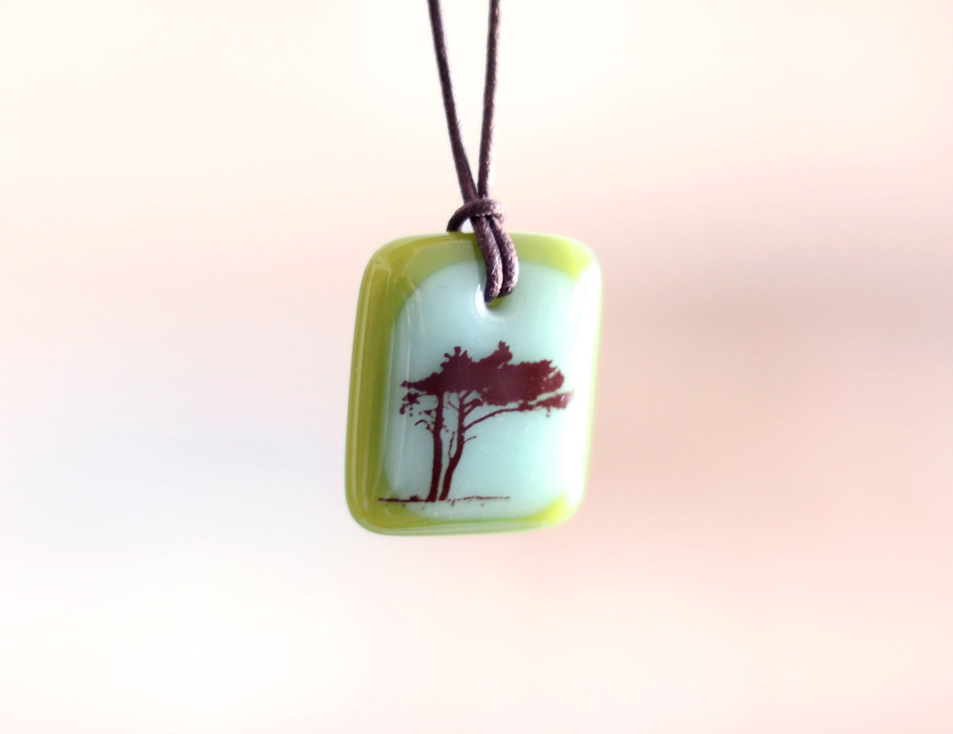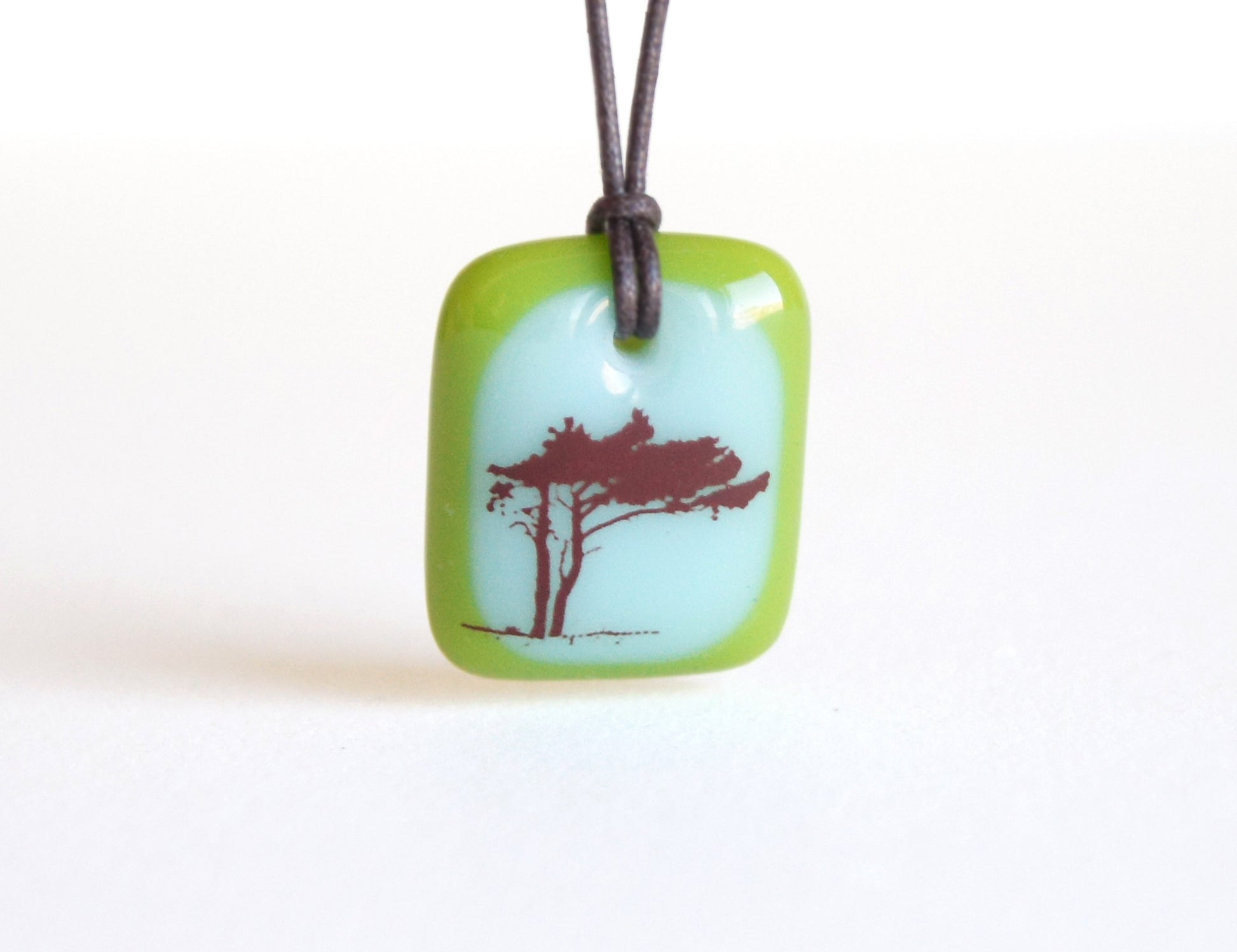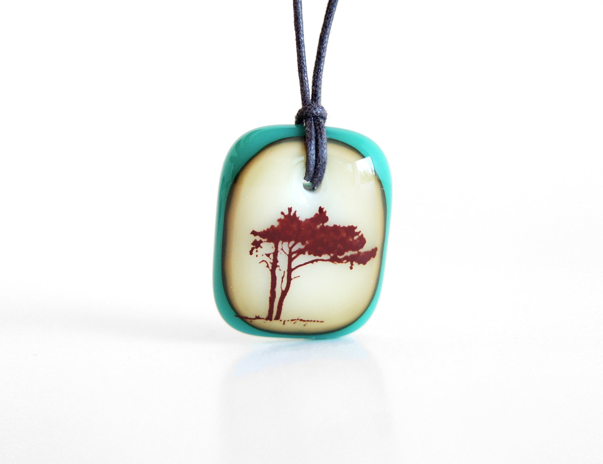 A photographic image of a wind blown tree permanently fused to a kiln-fired handmade glass pendant necklace, handmade by Leila Cools.