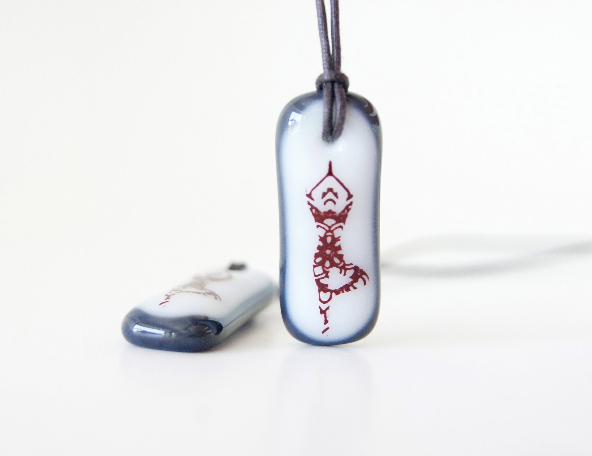 An illustration of yoga tree pose with a mandala design permanently fused onto a kiln-fired glass necklace, handmade by Leila Cools.